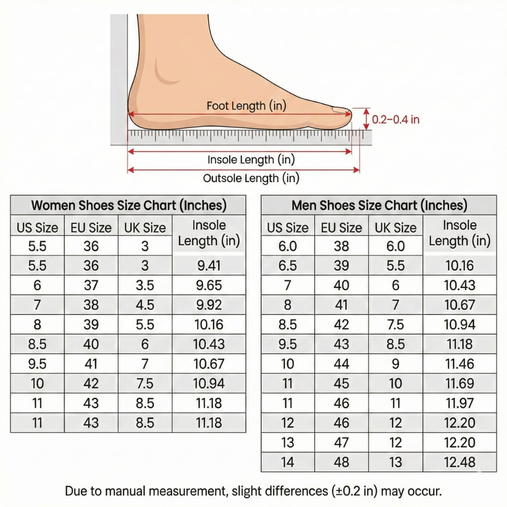 Due to manual measurement, slight differences (±0.2–0.4 in) may occur.