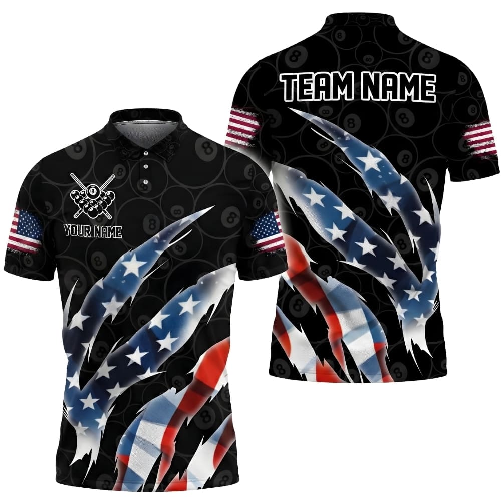 Bold American flag billiards polo shirt featuring a dynamic USA claw design and 8-ball pattern.