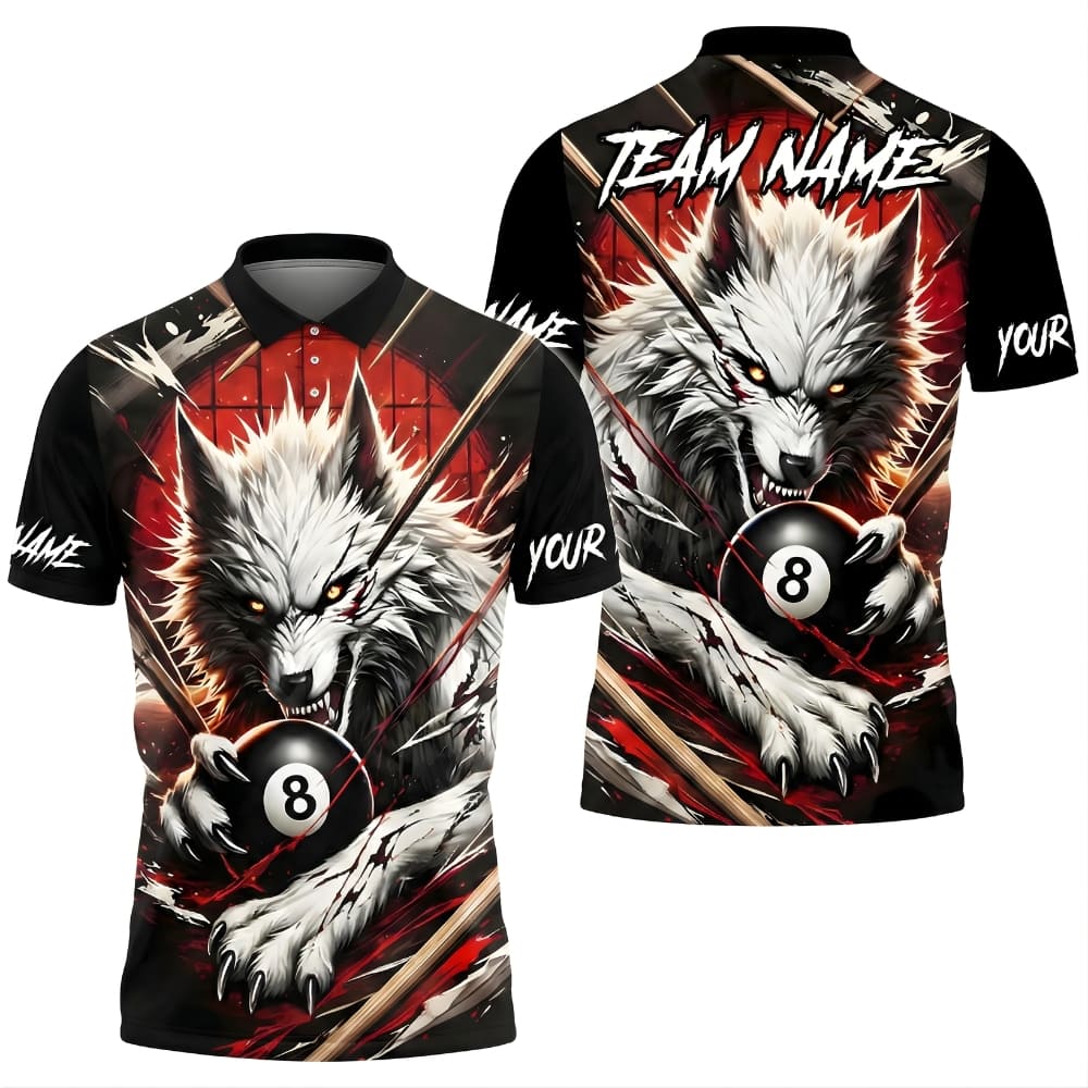 Unleash fierce energy on the table with the Bloody Wolf 8 Ball billiard polo shirt, featuring a powerful wolf design and bold 8-ball artwork.