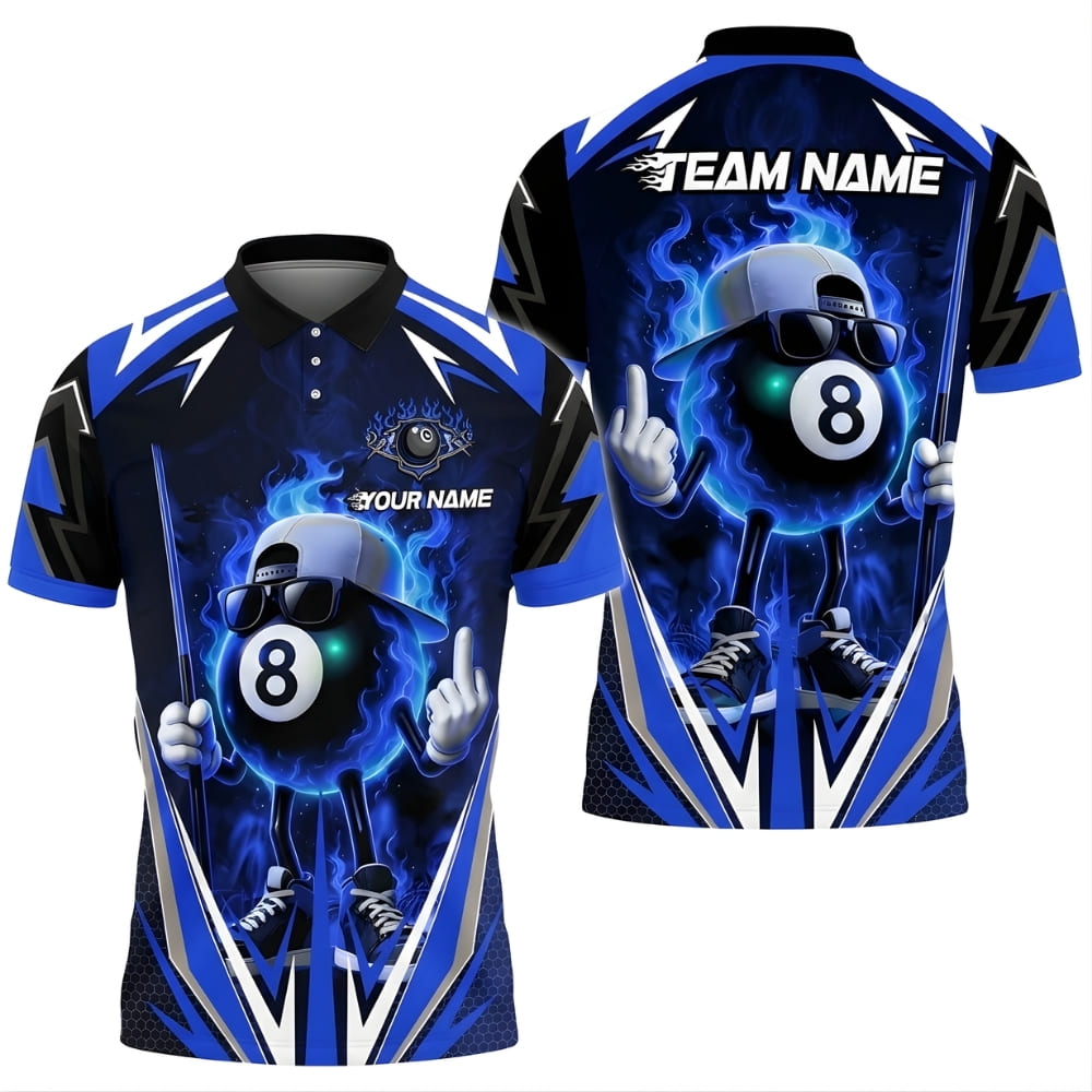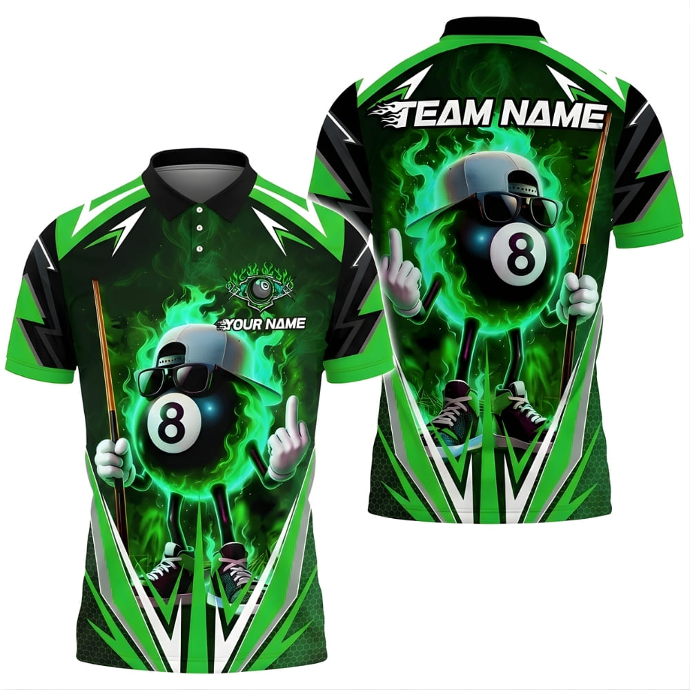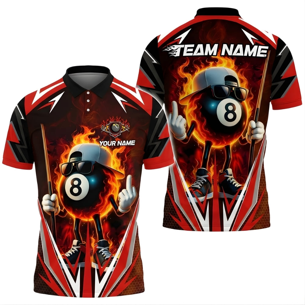 Stand out at the pool table with this custom 8 ball billiards polo shirt, featuring a bold flaming 8-ball character design.