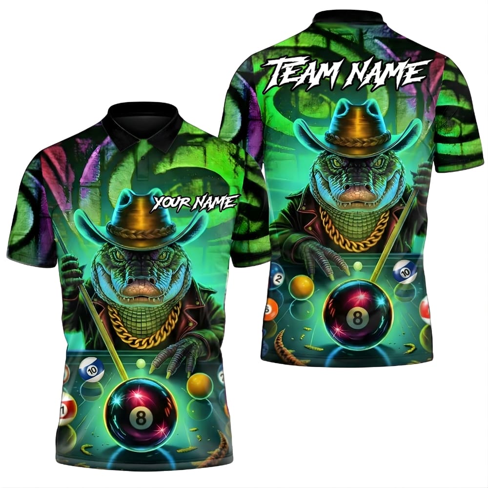 Bold custom billiard polo shirt featuring the fierce Crocodile Breaker design with 8 ball details.