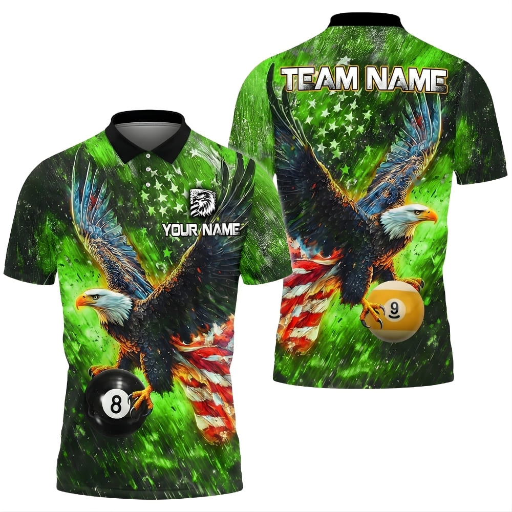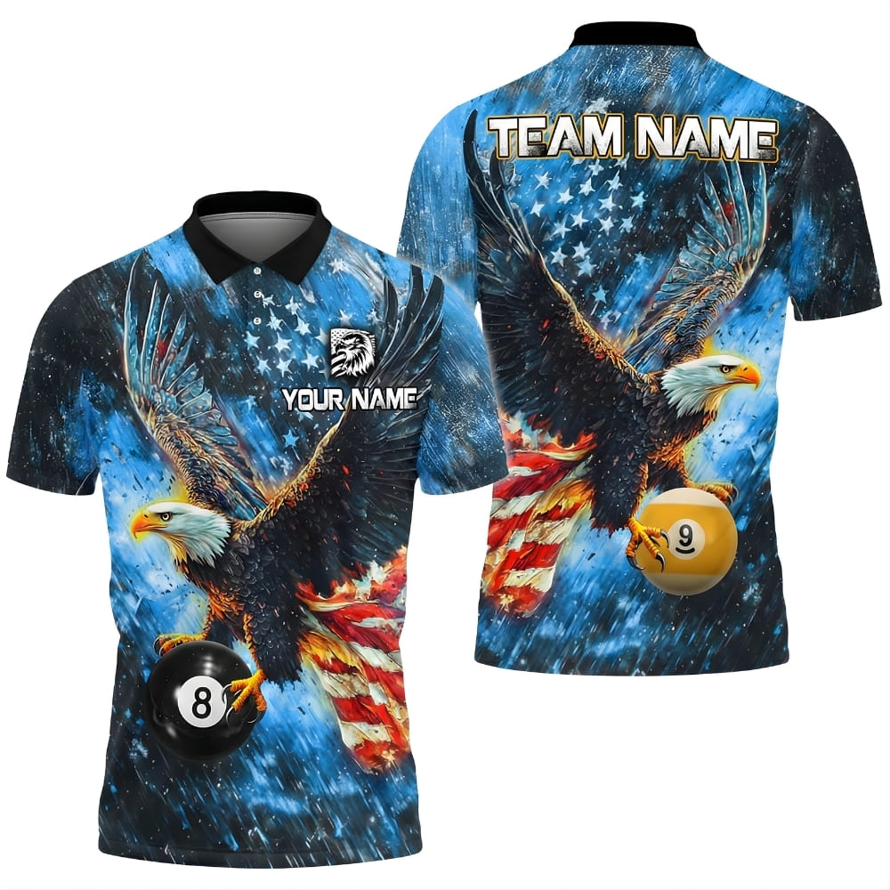 Custom billiard polo shirt featuring a powerful bald eagle graphic with fiery storm textures and American star elements.