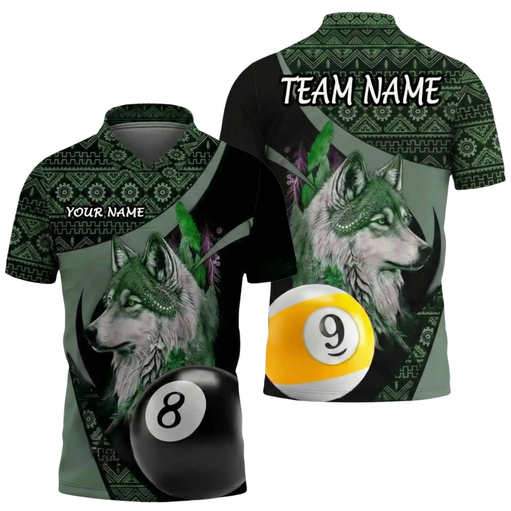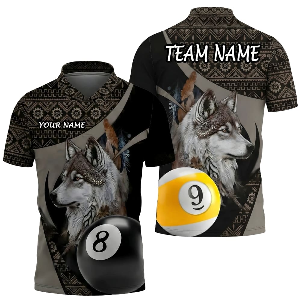 This custom billiard polo shirt features a tribal wolf spirit combined with both 8 ball and 9 ball elements, set against detailed native-inspired patterns for a bold and symbolic look.