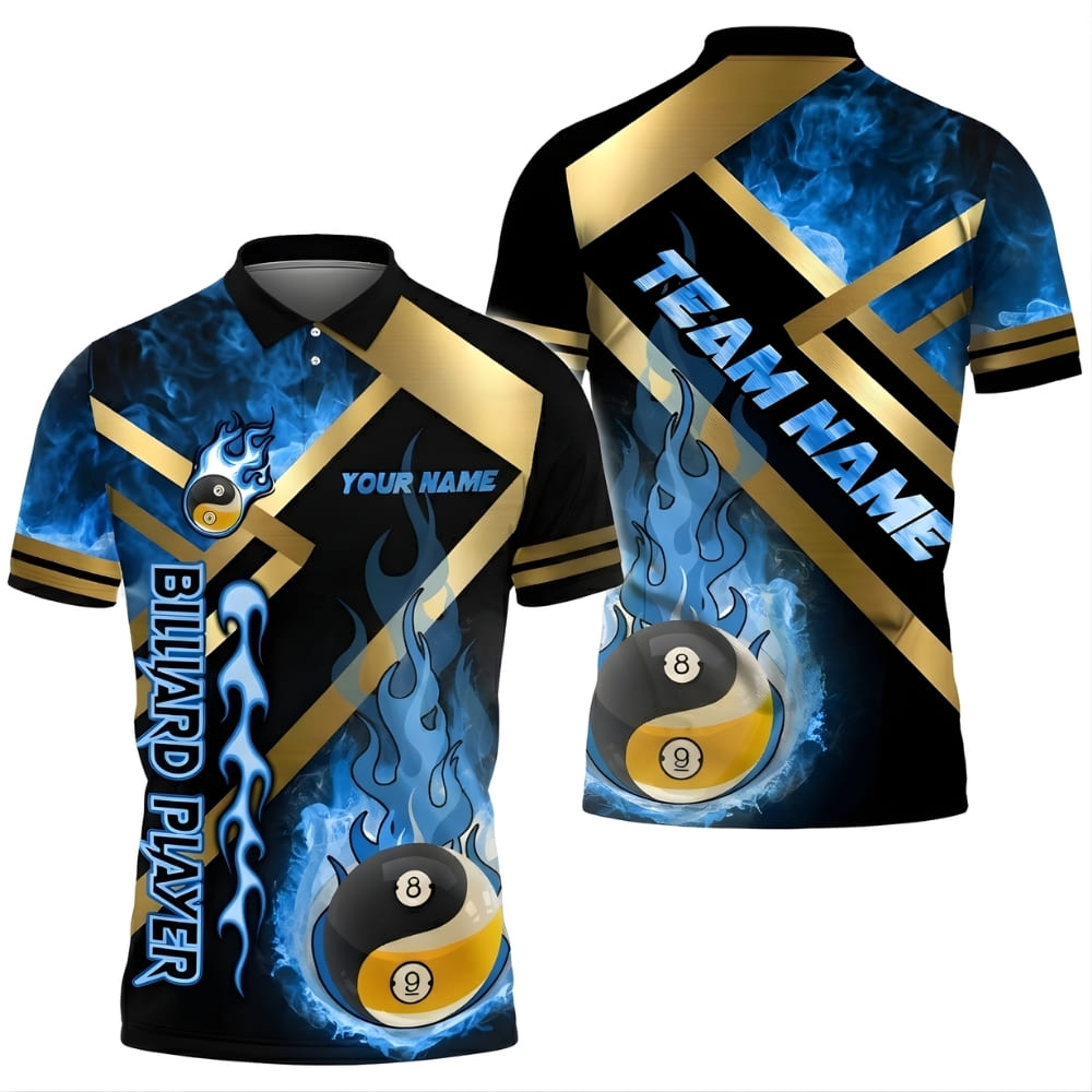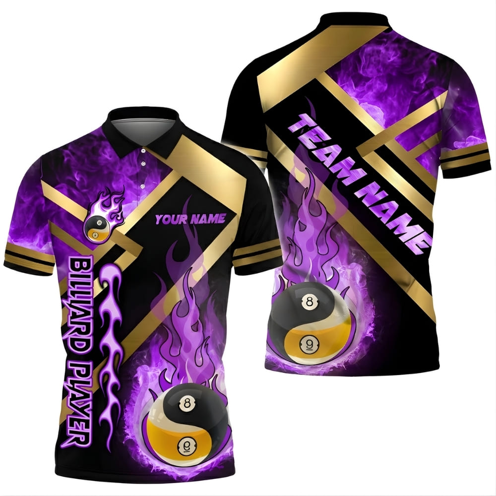 This custom billiards polo shirt features a bold fire 8-ball design with a premium all-over print. Fully customizable with your name and team name, it’s perfect for billiards teams, pool leagues, tournaments, or casual wear. Made with breathable, comfortable fabric for confident play and all-day comfort.