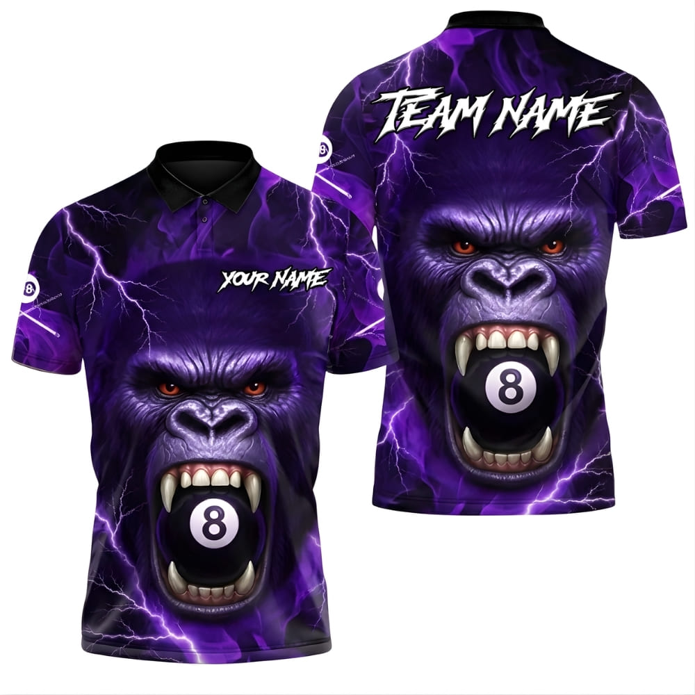 Unleash a fierce presence at the pool table with this custom billiards polo shirt featuring a powerful gorilla lightning 8 ball design. Fully personalized with your name or team name, made from breathable, stretchy fabric for comfort during matches, tournaments, or casual wear. Perfect for billiards teams, pool leagues, and serious players.