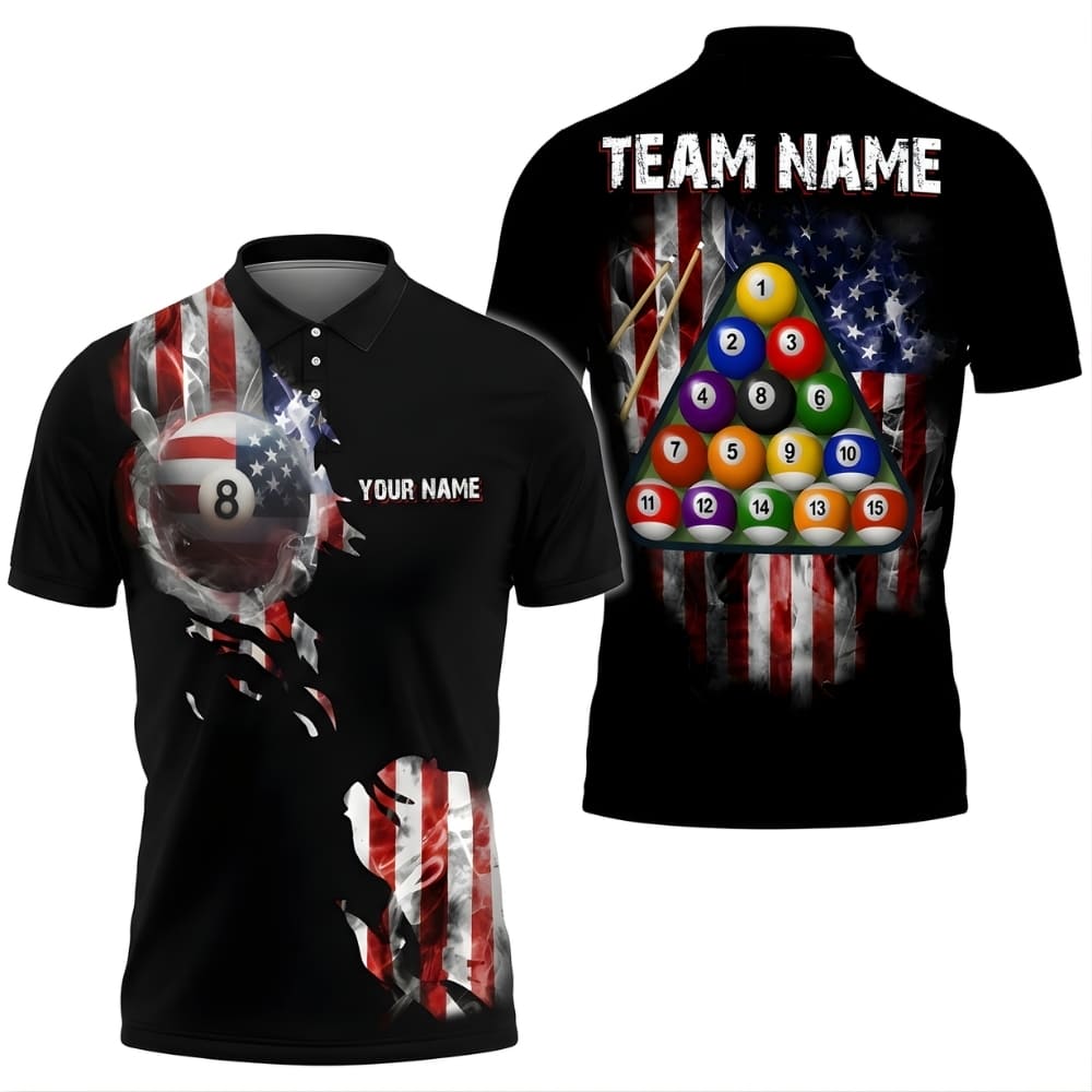 Custom Billiards Polo Shirt – Personalized 8 Ball Pool Shirt with USA Flag Design