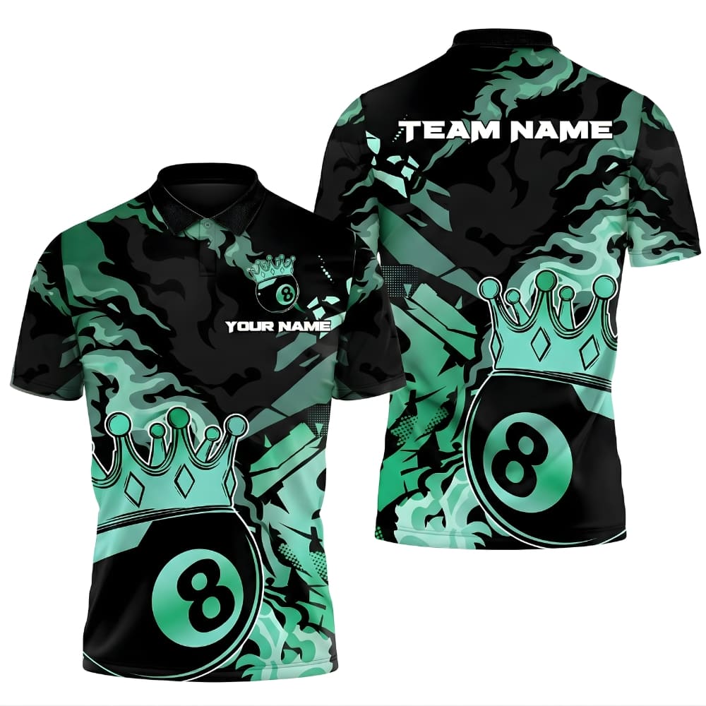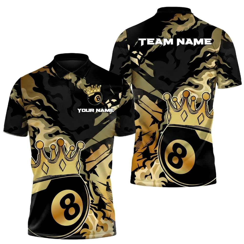 Custom billiards polo shirt with a bold 8 ball crown design for a royal look on the table.