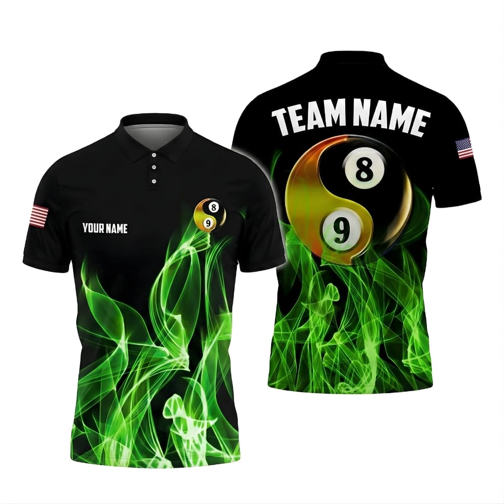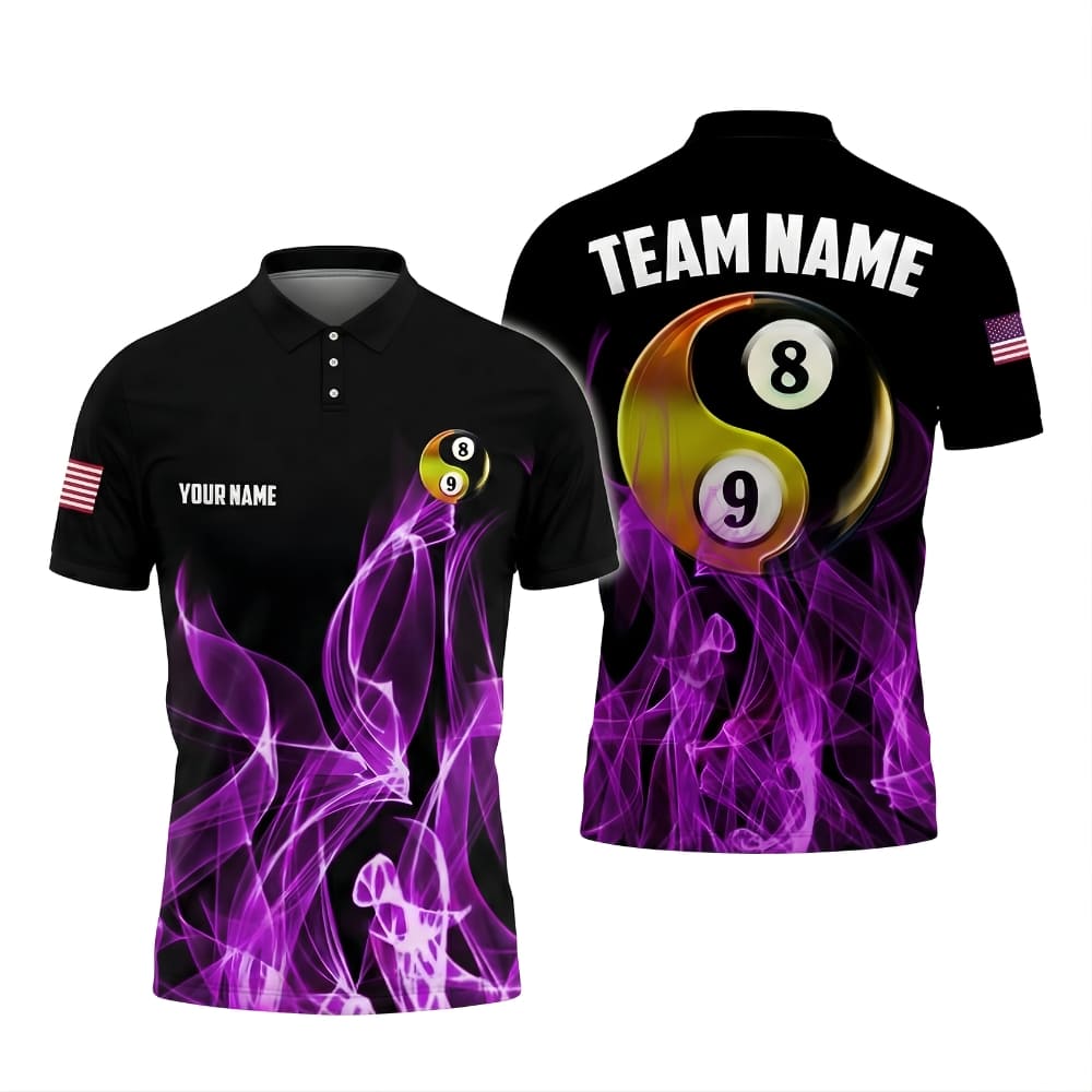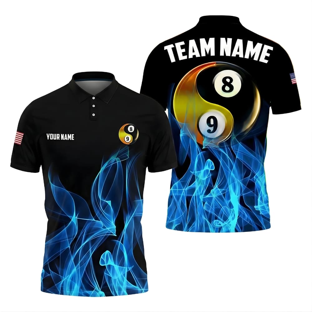 Personalized billiards polo shirt featuring a bold 8 ball yin yang design.