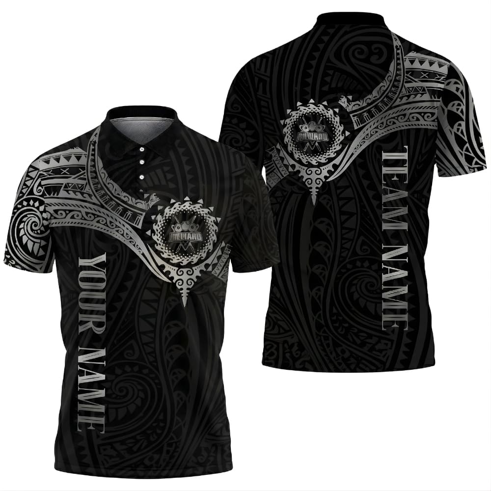 Premium custom billiards polo shirt featuring a bold tribal luxury design, perfect for pool teams and tournaments.