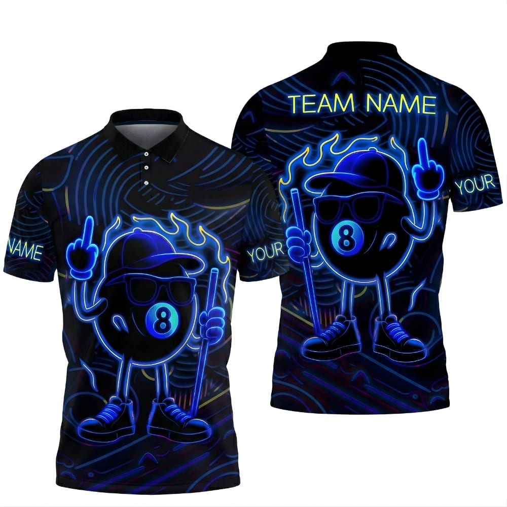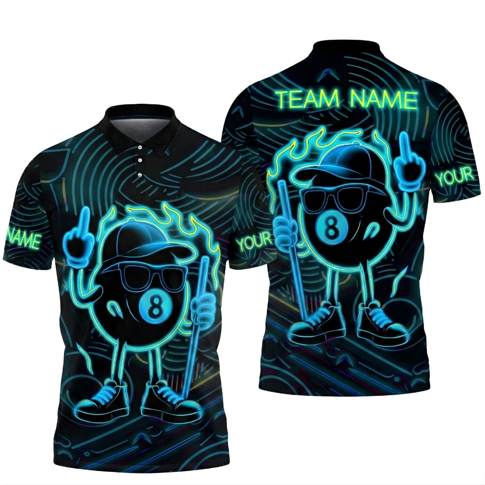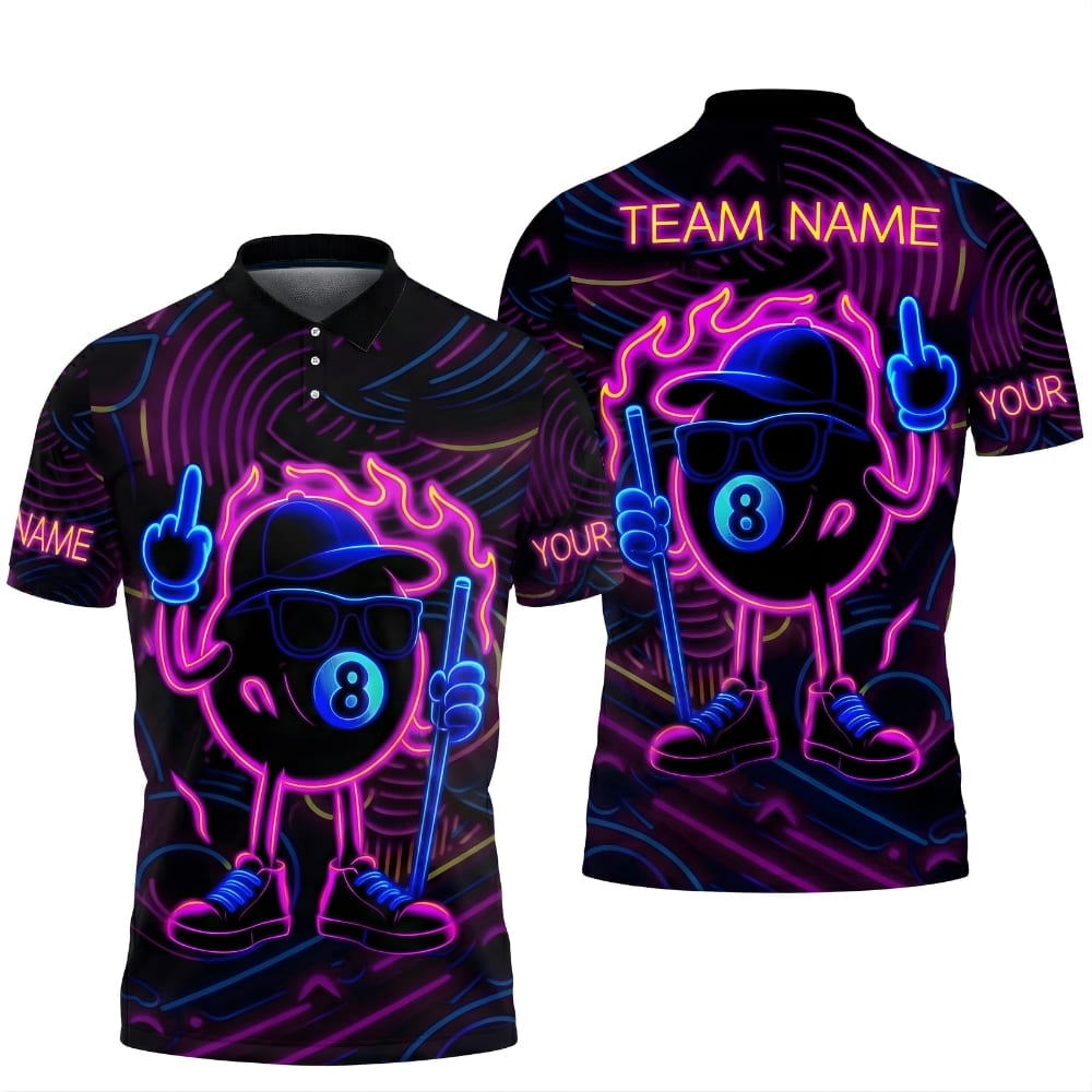 Stand out with this neon-style 8 ball billiard polo shirt featuring a bold glowing design.