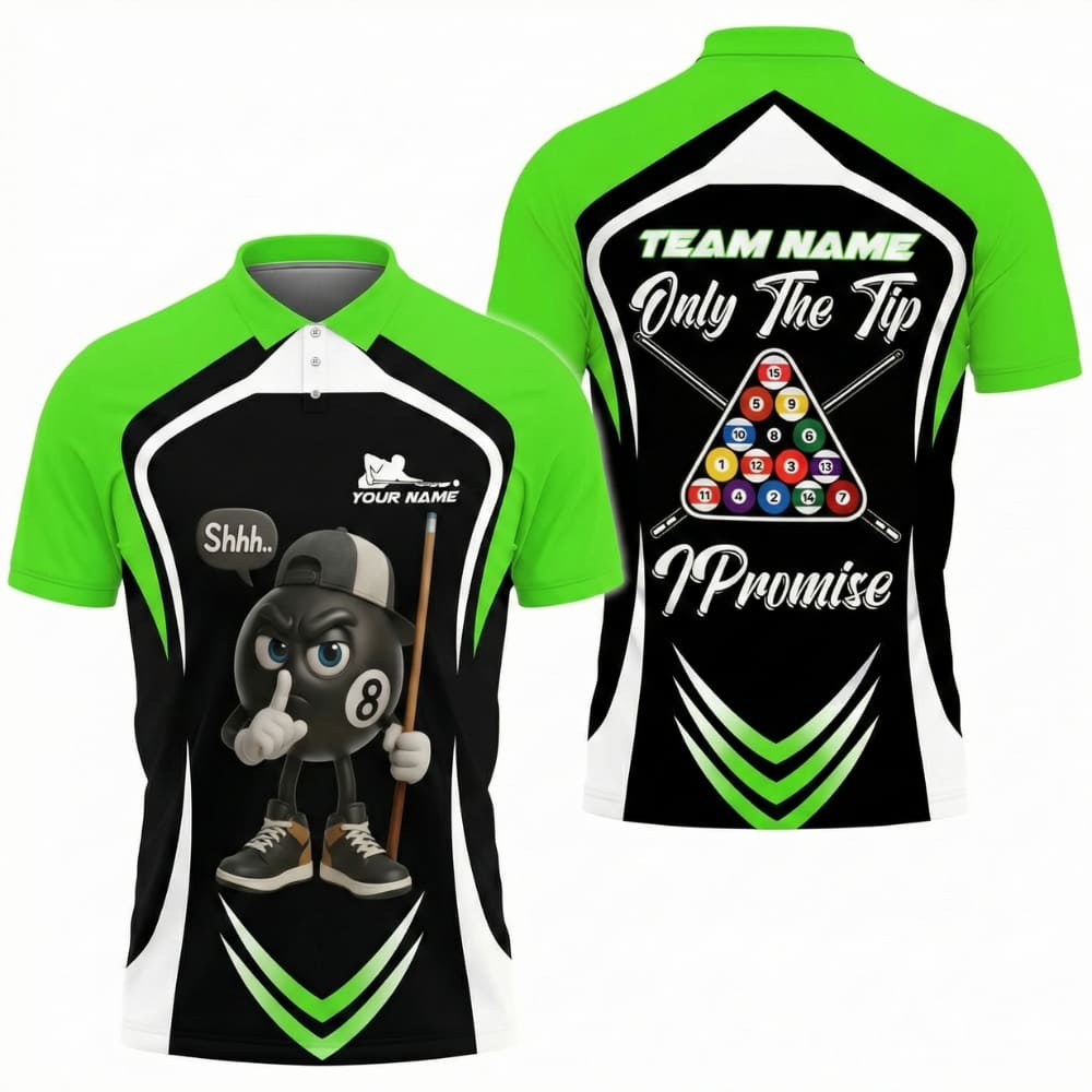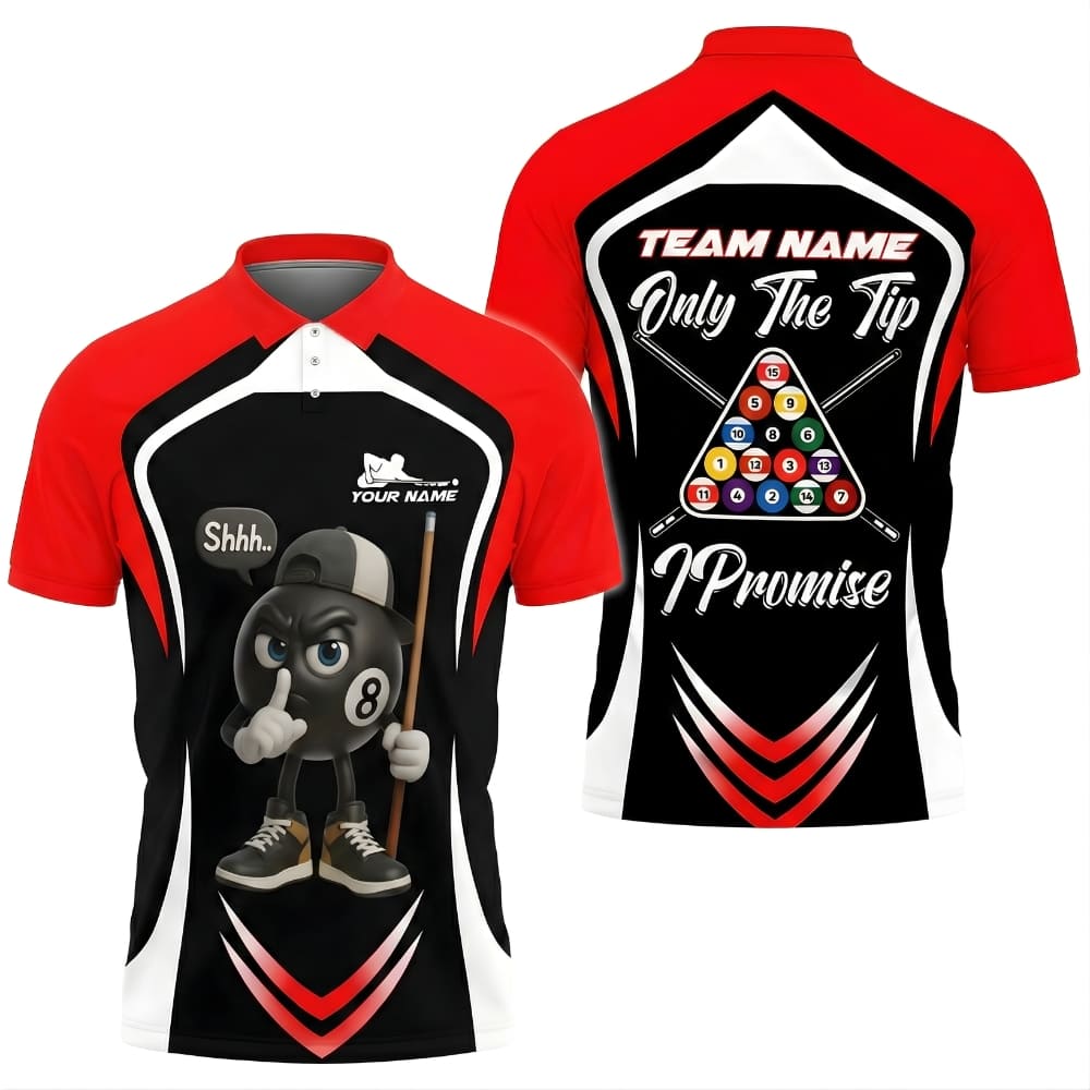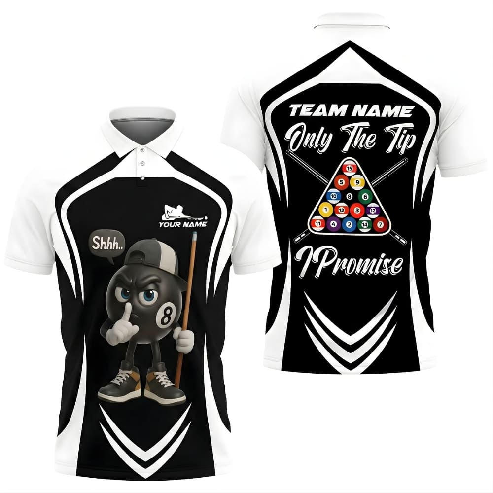 Fun and bold custom billiards shirt featuring a cartoon 8 ball character with the iconic “Only The Tip, I Promise” slogan.