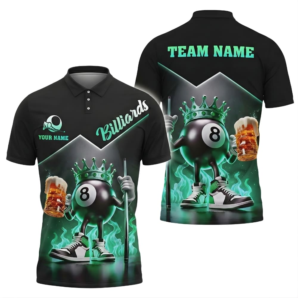Stand out on game night with this King 8 Ball billiards polo shirt featuring a bold crowned 8-ball design.