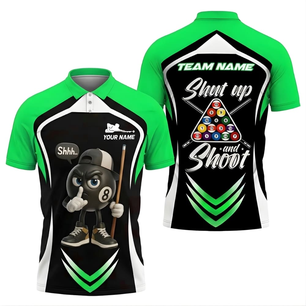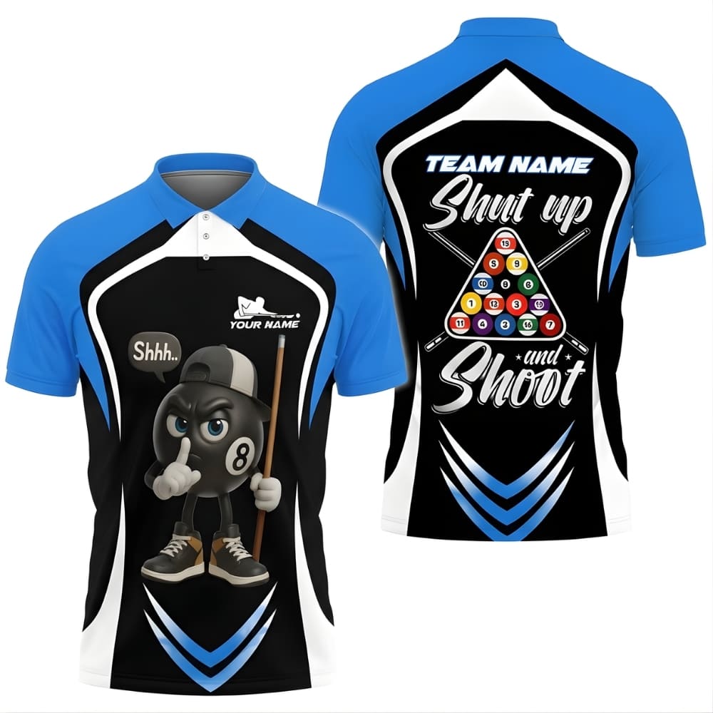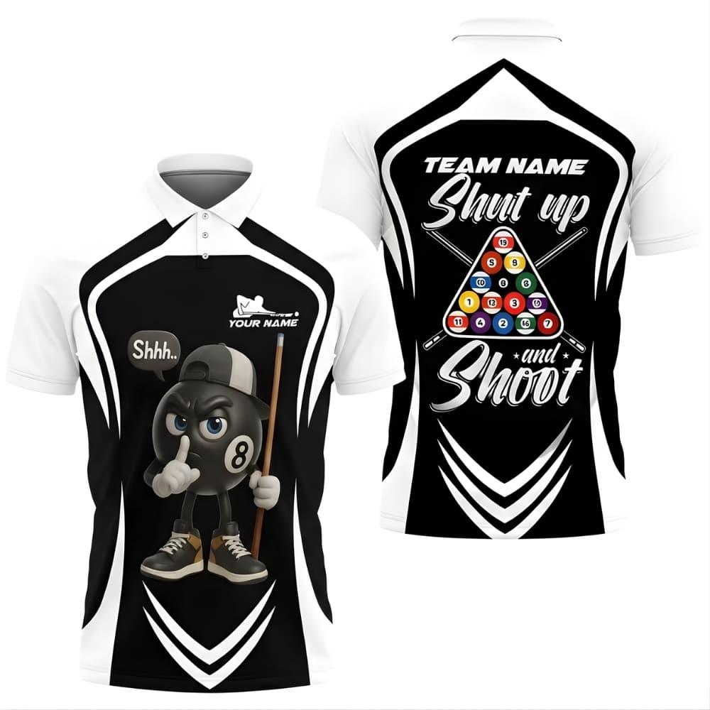 Stand out at the pool table with this Shut Up and Shoot custom billiards polo shirt, featuring a bold 8-ball cartoon design and a playful quote.