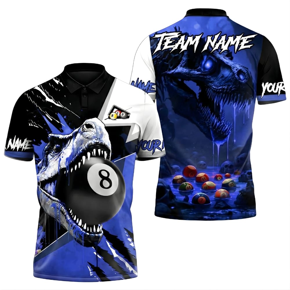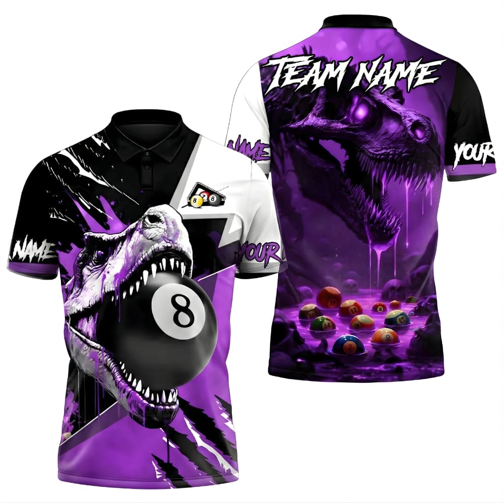 Unleash raw power at the pool table with the T-Rex Fury custom billiard shirt, featuring a fierce T-Rex design gripping the iconic 8-ball.