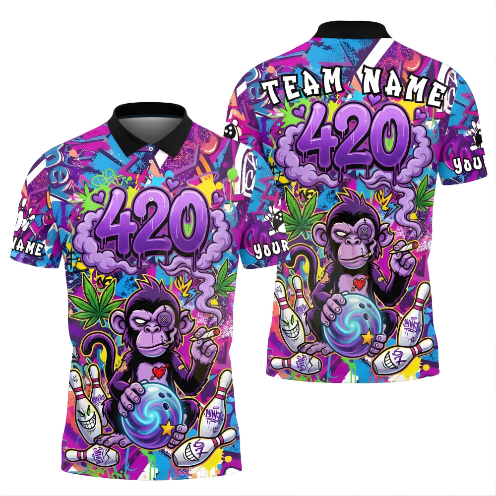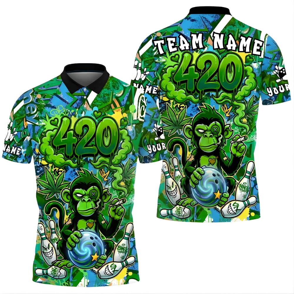 This 420 Monkey Bowling Shirt features a bold cartoon graphic combined with a high-energy bowling theme. Designed for league nights, tournaments, or casual play, it can be customized with your team name for a standout look on the lanes.