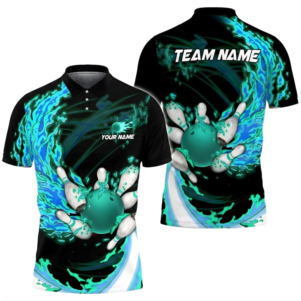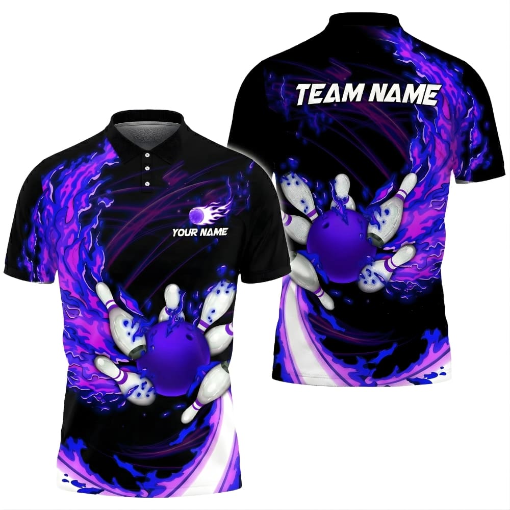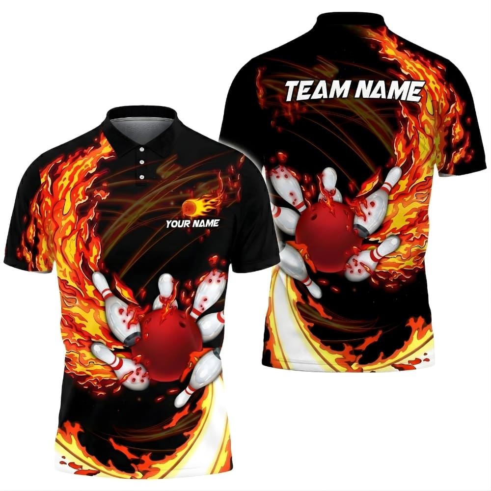 Stand out on the lanes with this bold bowling polo shirt, featuring a fiery bowling design and custom name options.