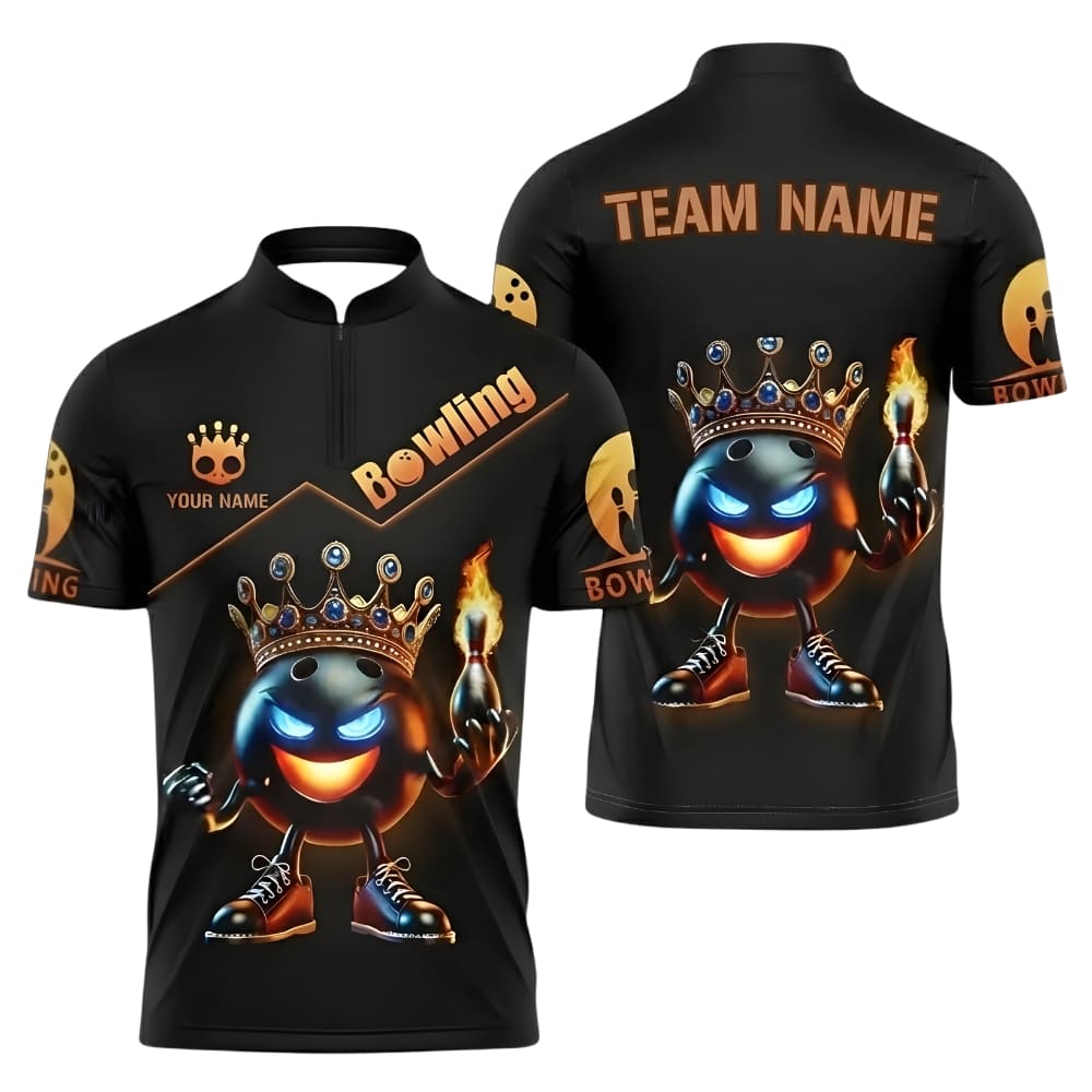 This custom bowling polo shirt features a bold Bowling King graphic with crown and flame bowling ball, designed for serious league players and tournament teams.