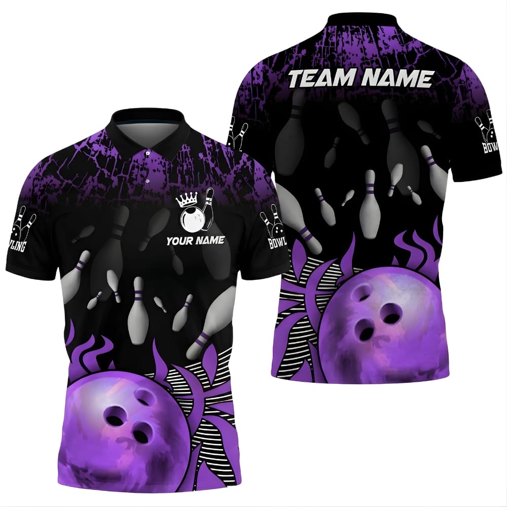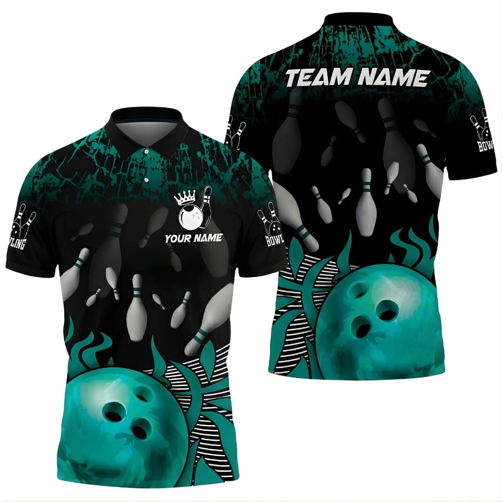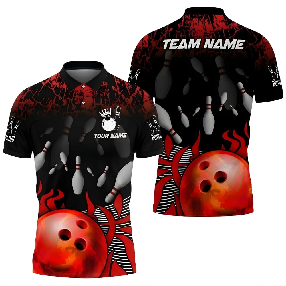 Custom Bowling Polo Shirt – Flame Bowling Ball Design, Personalized Team Name & Player Name