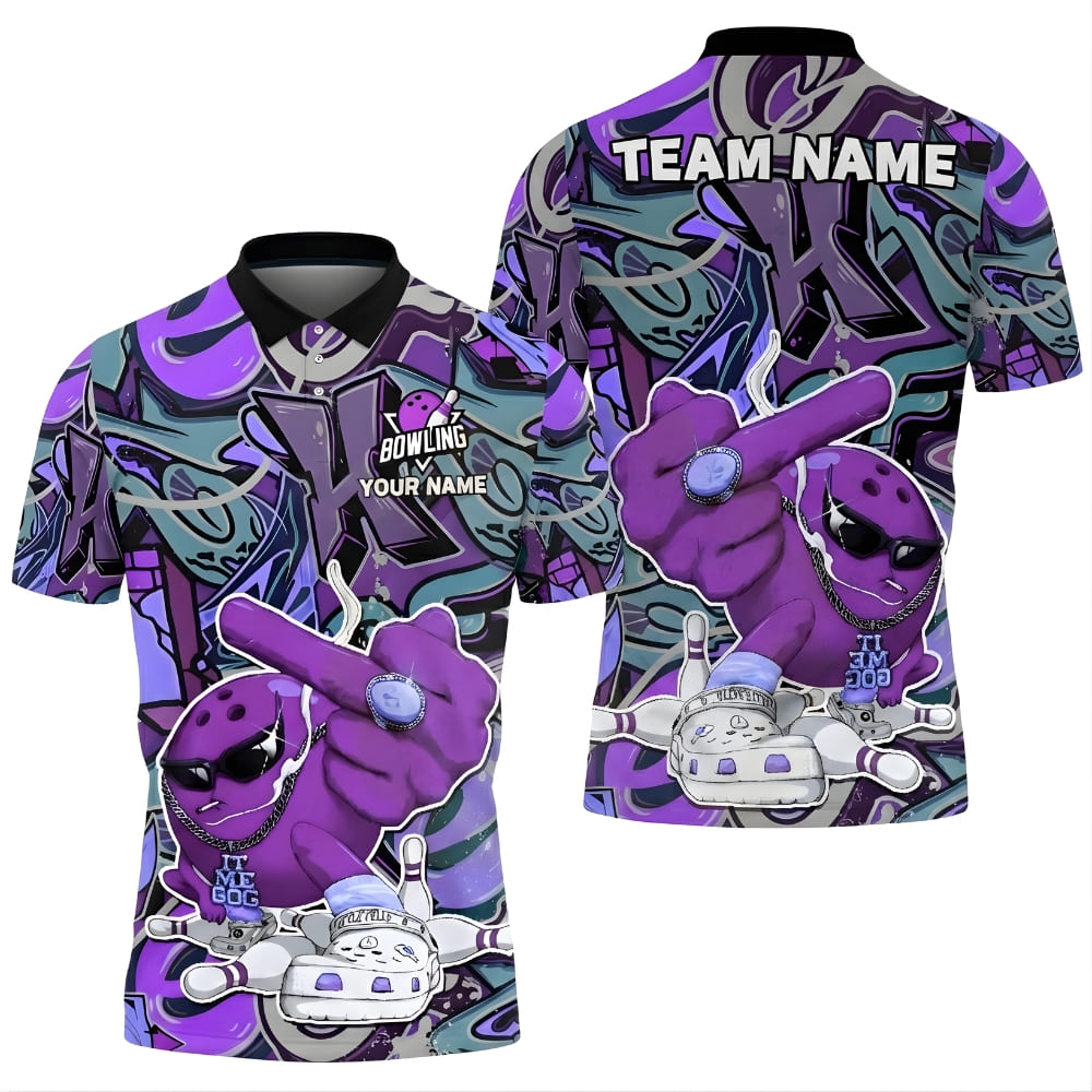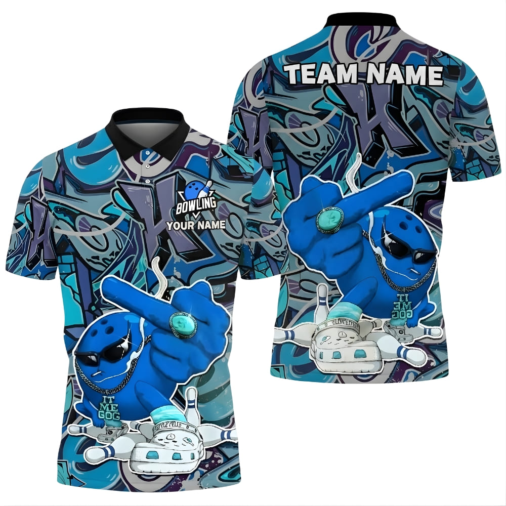 This custom bowling polo shirt features a bold street graffiti style with a cartoon bowling character, creating a fun and competitive look for league nights or tournaments.