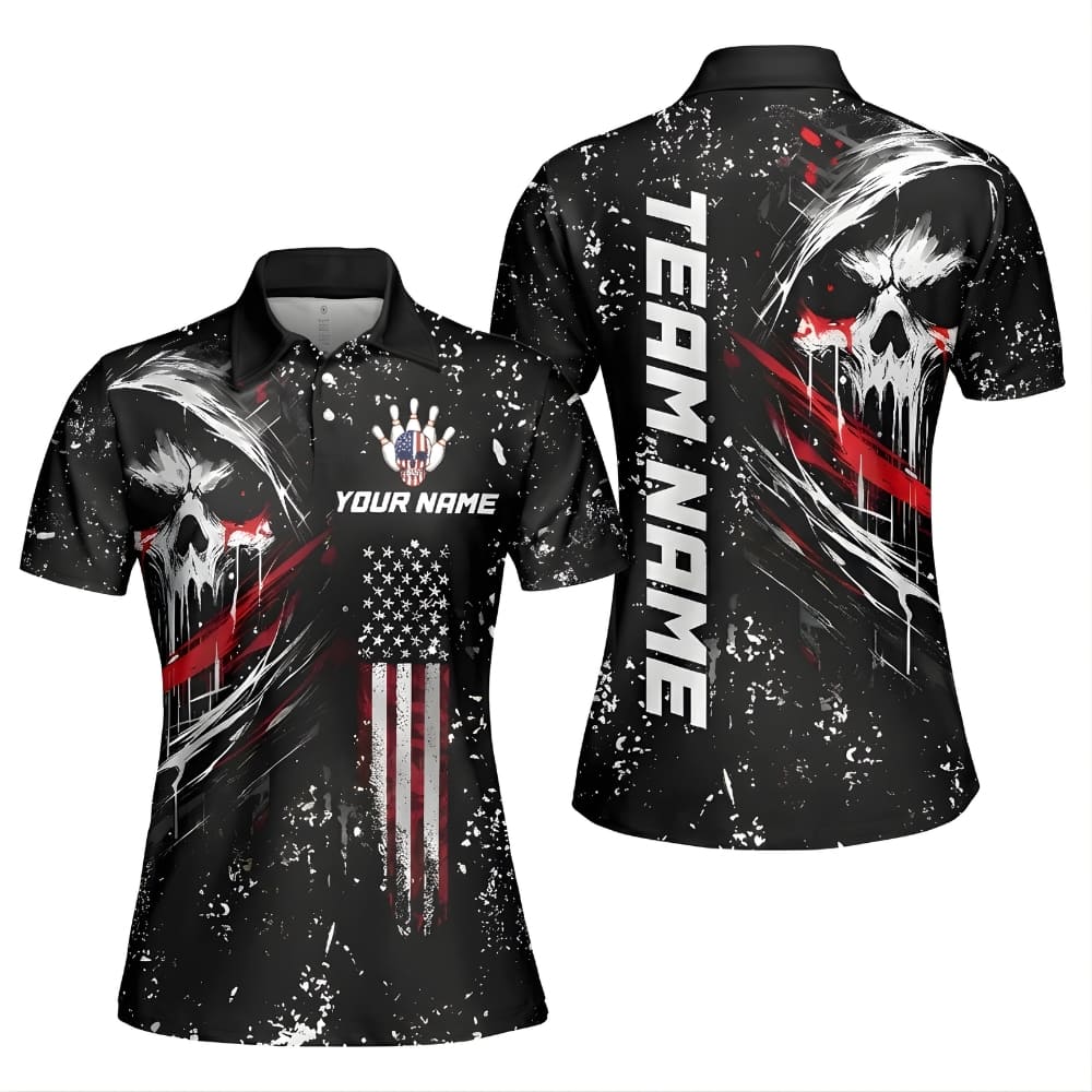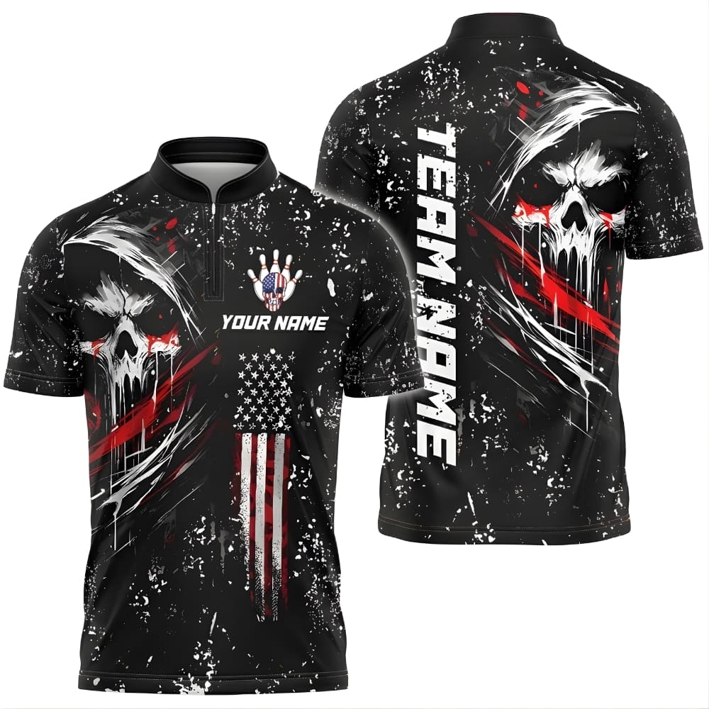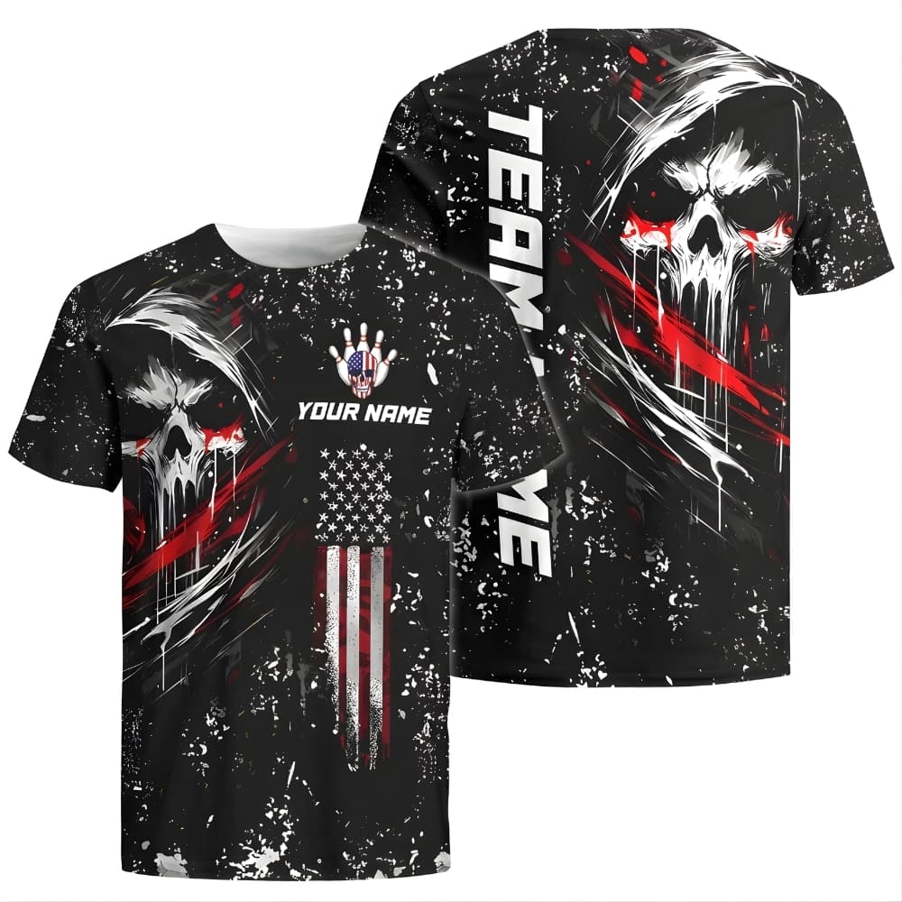 This custom bowling shirt features a bold skull graphic with a powerful, edgy style made for serious bowlers.