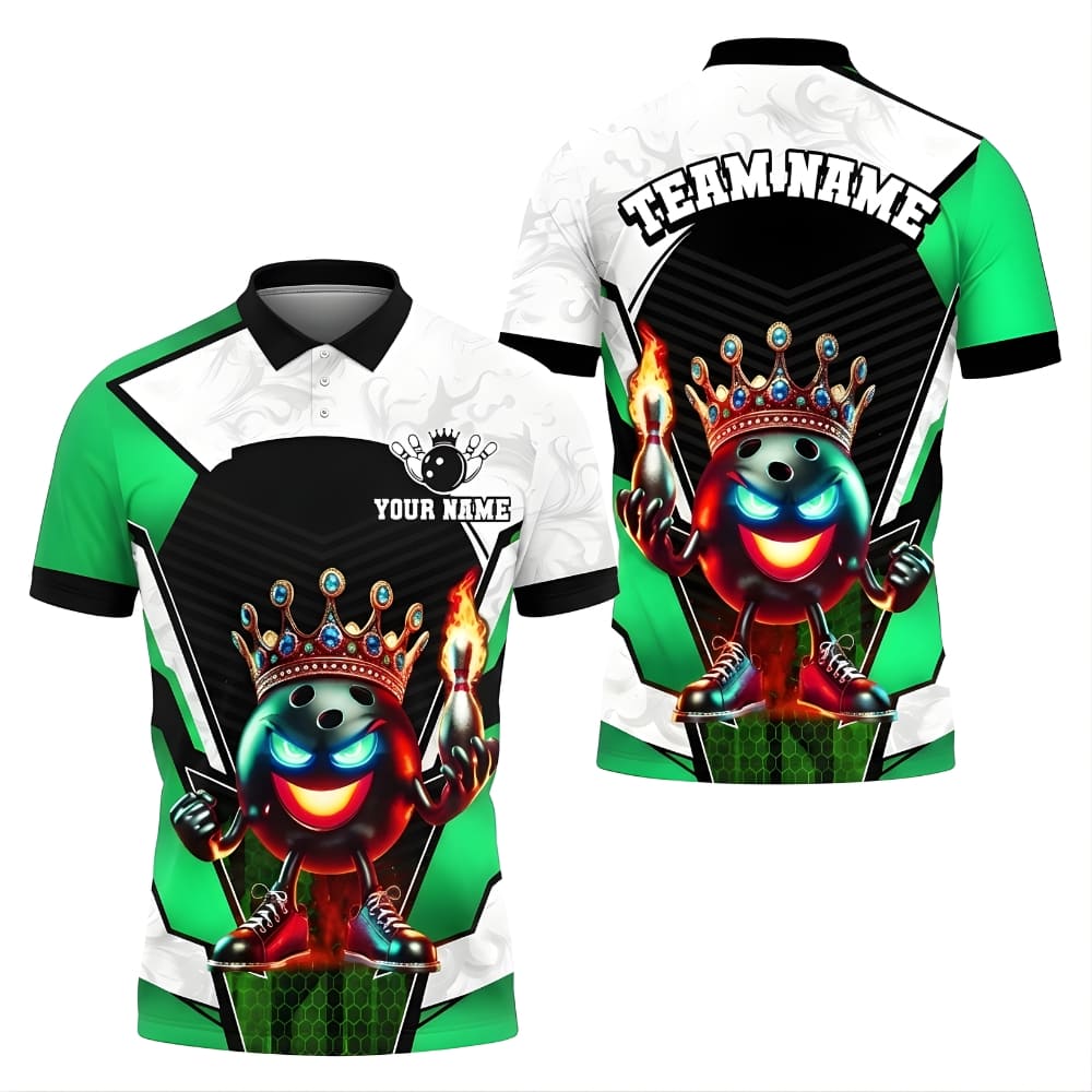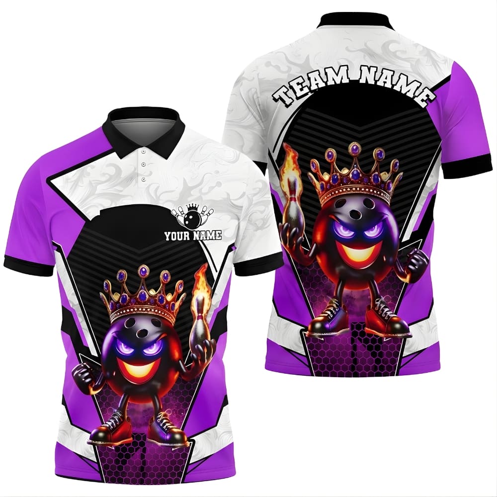 This custom bowling polo shirt features a bold king bowling ball design with crown details, perfect for league nights or tournaments.