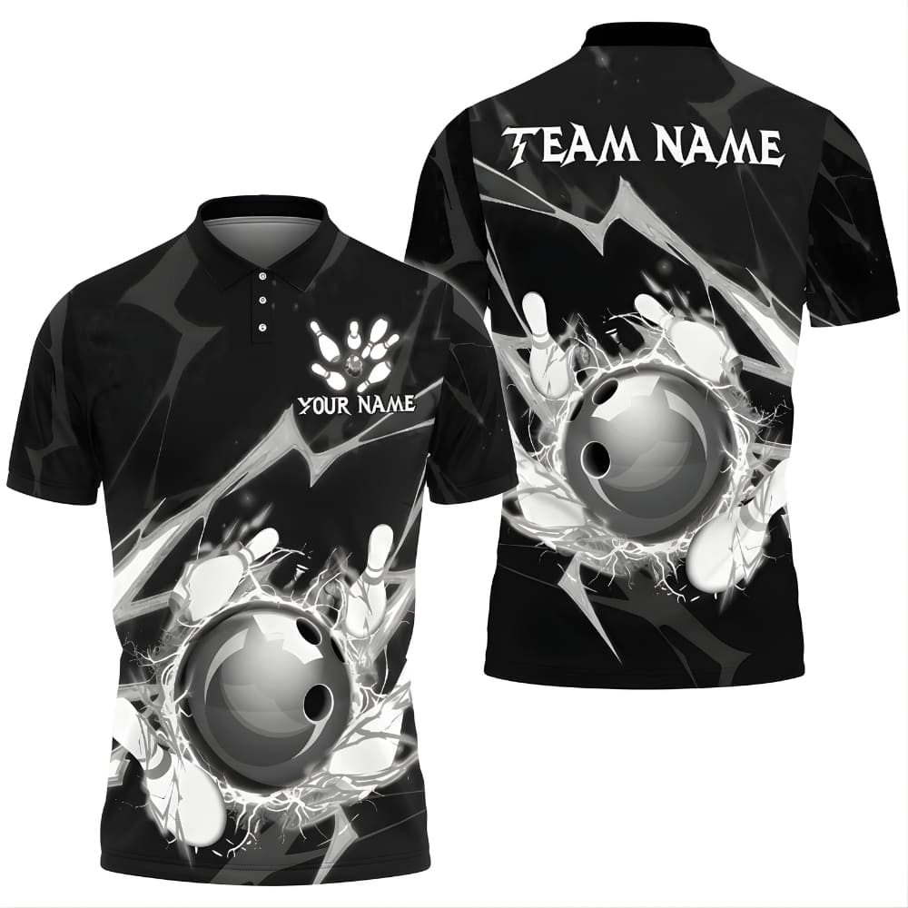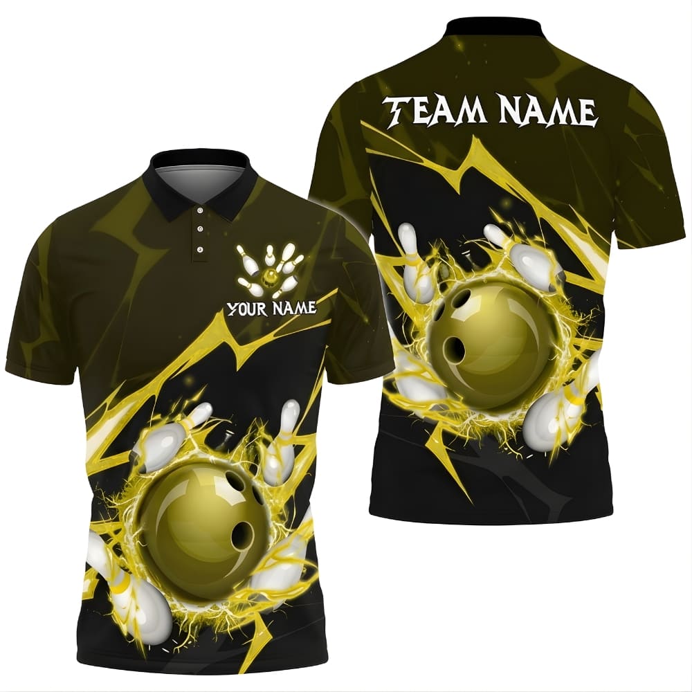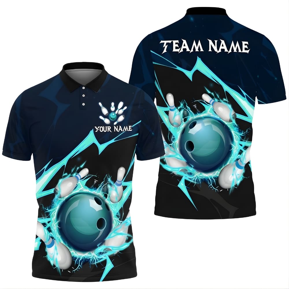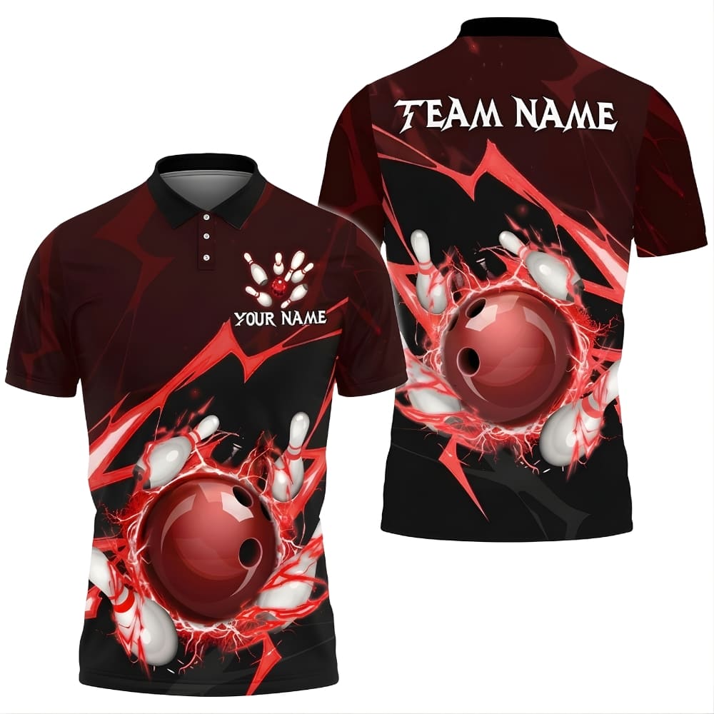 This personalized bowling polo shirt features an electric lightning bowling ball and pins design, perfect for competitive leagues and team matches. Custom name and team details give your bowling outfit a bold, high-energy look.