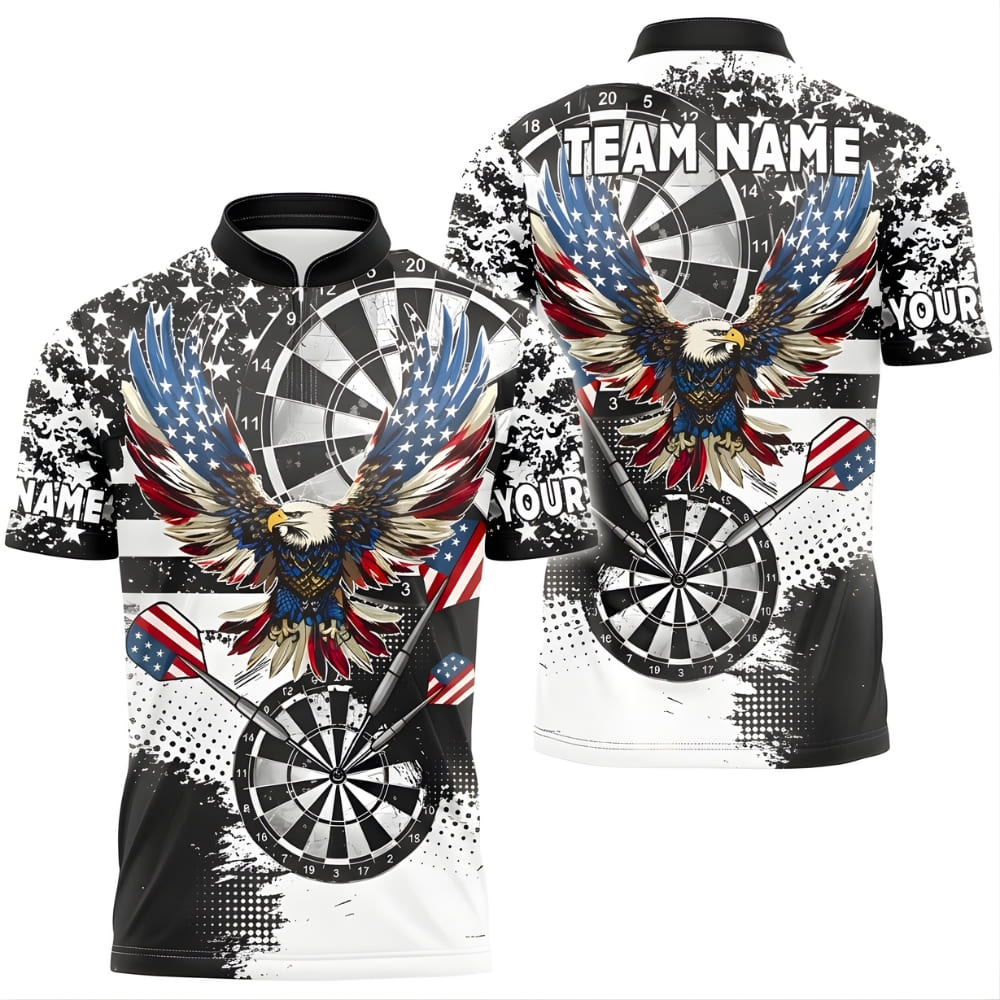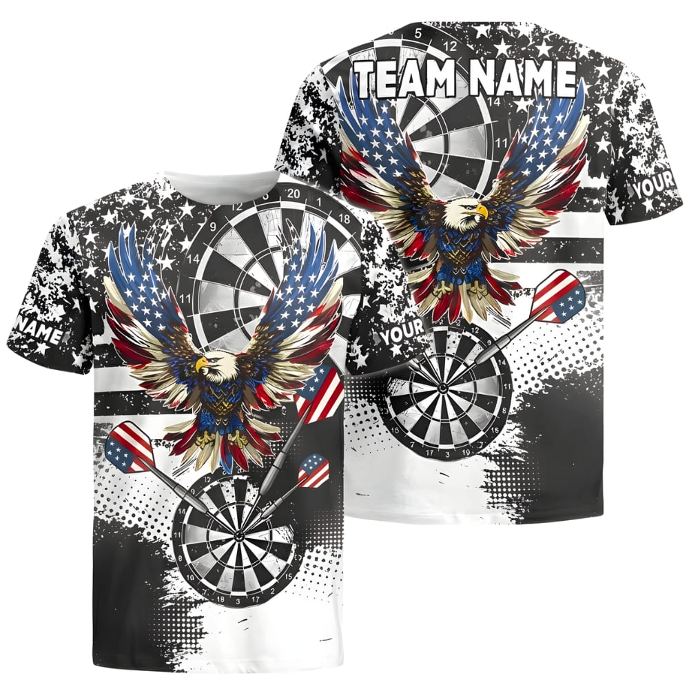 Stand out on the dartboard with this American Eagle darts team shirt, featuring a powerful bald eagle design inspired by USA patriotism. Fully customizable with your name and team name, this premium darts jersey is perfect for league matches, tournaments, or team uniforms. Bold, breathable, and made to perform under pressure.