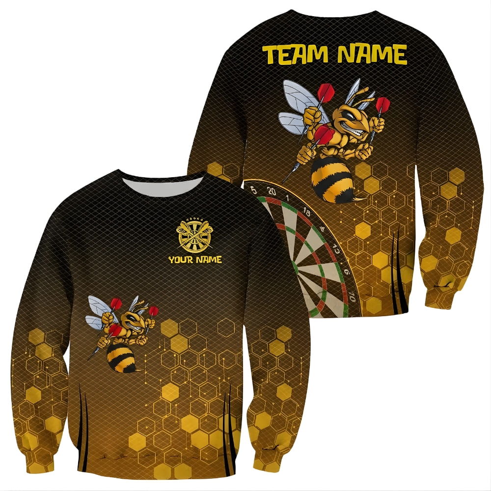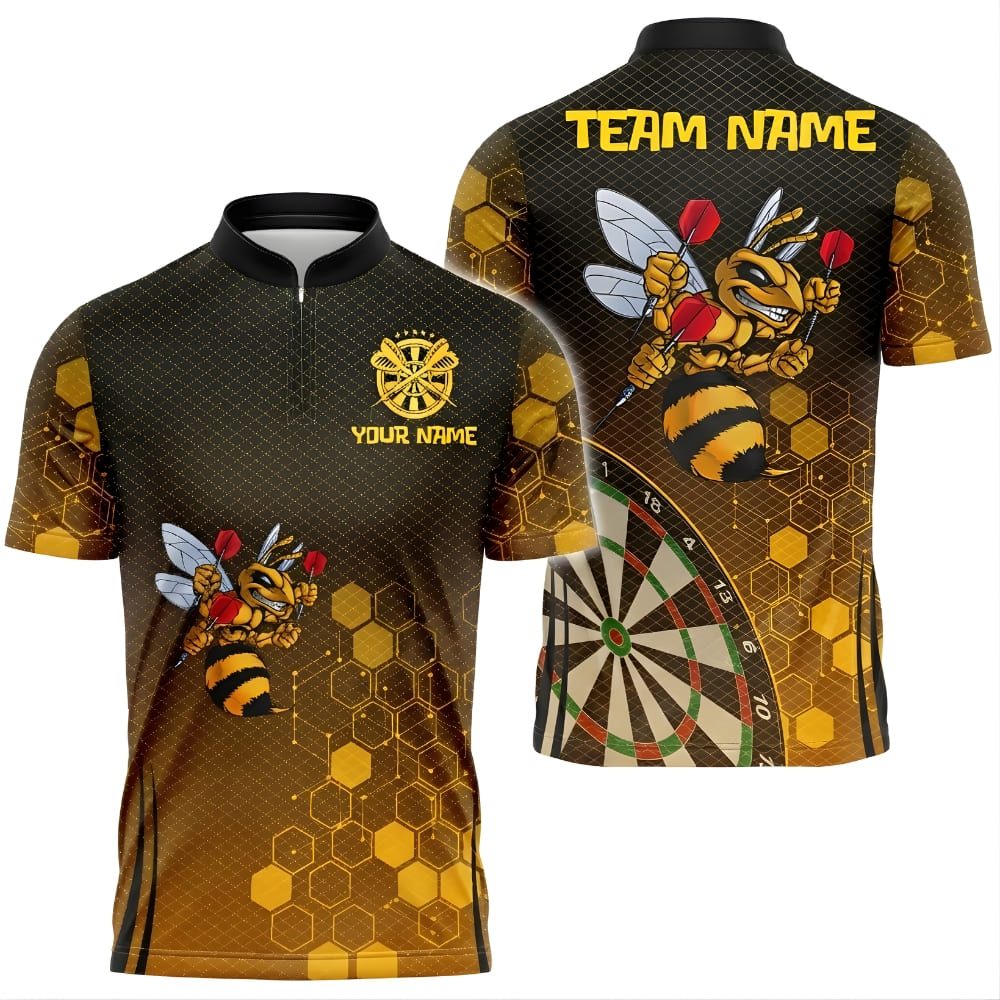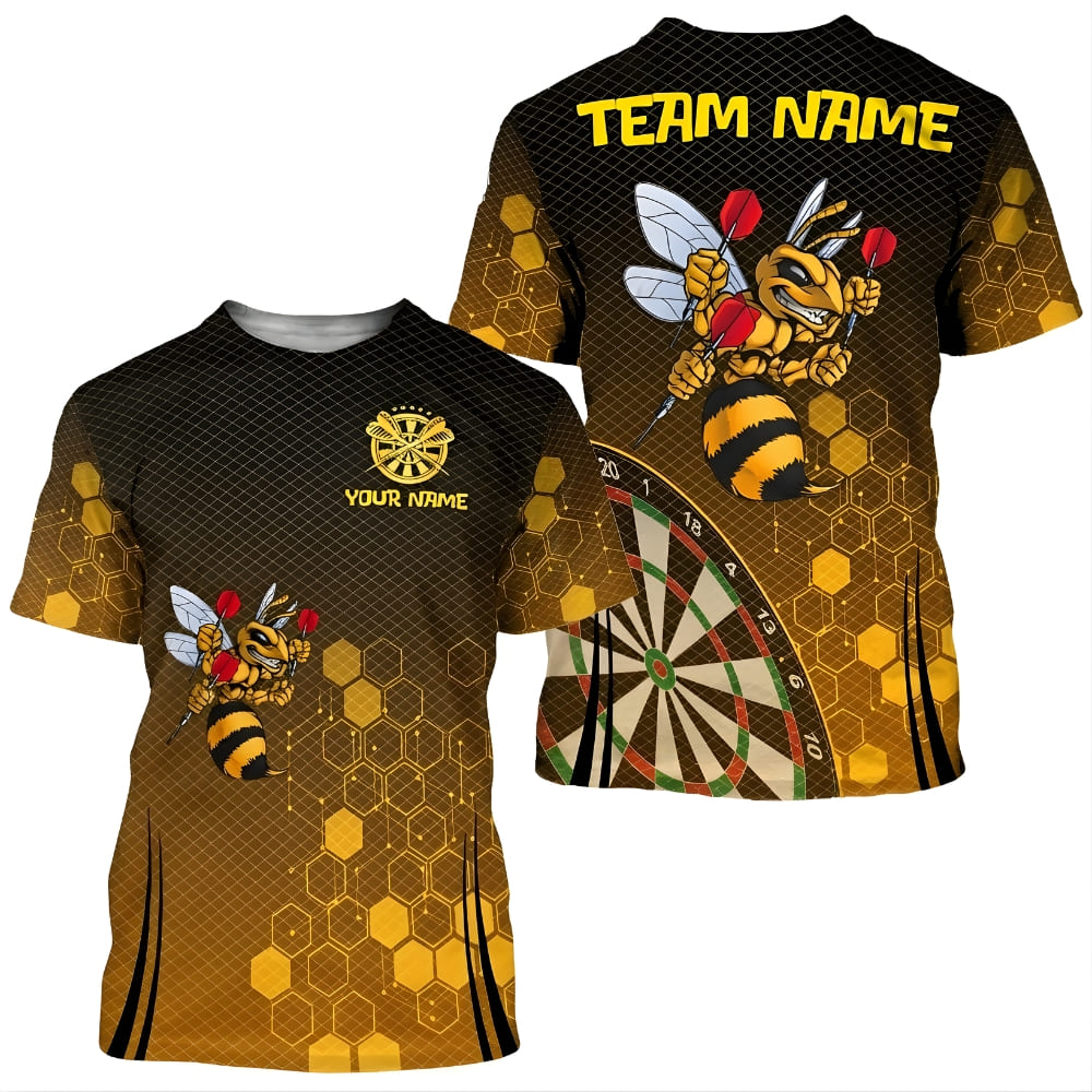 Stand out on game night with this Bee Darts custom team shirt, featuring a bold honeycomb design and aggressive bee mascot.