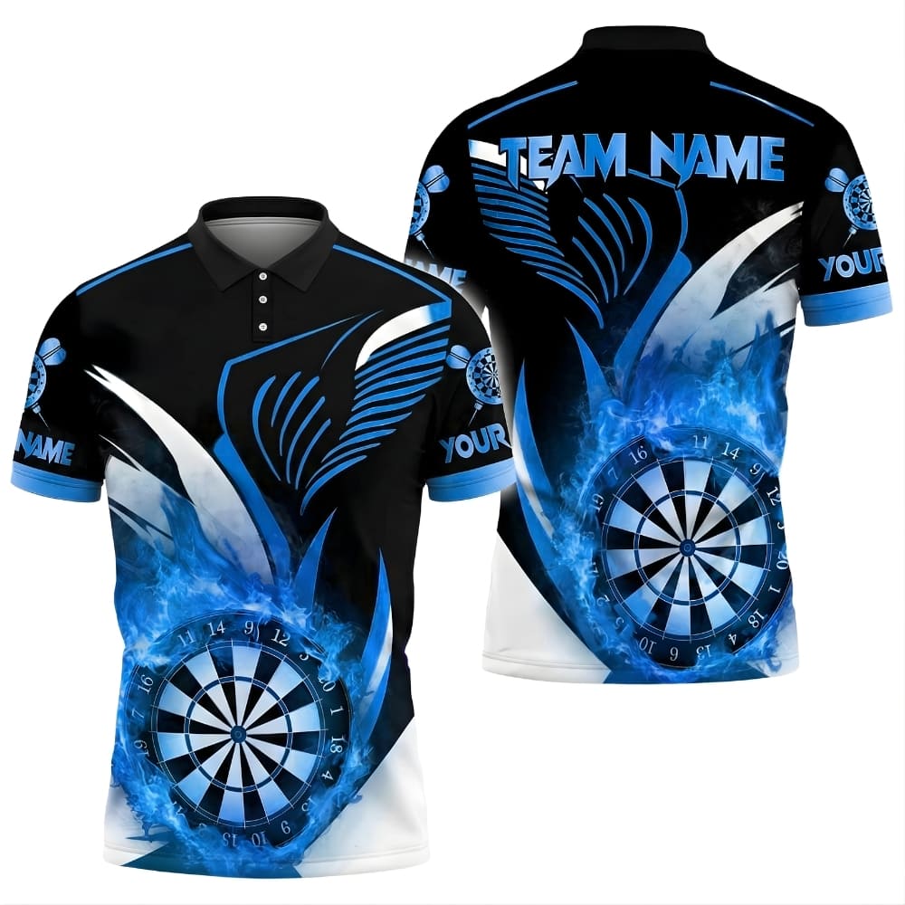 Stand out on dart night with this custom dart team polo shirt featuring a bold flame dartboard wing design.