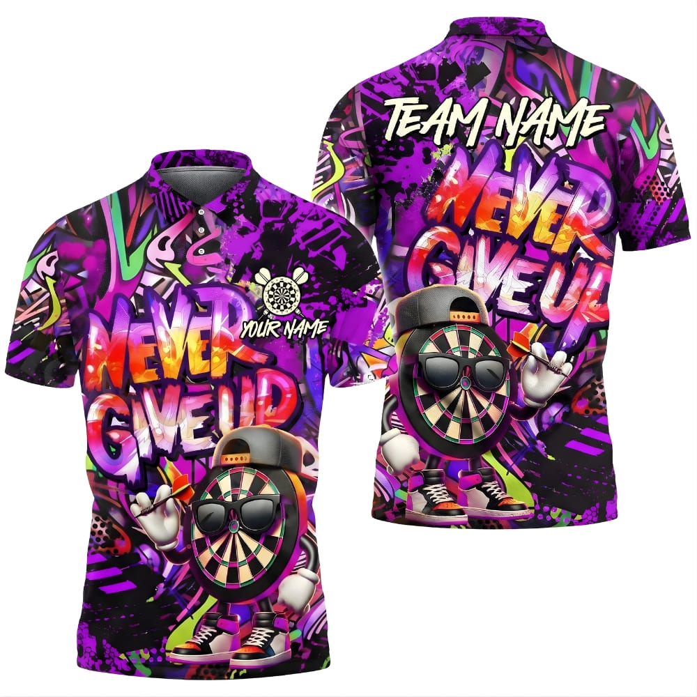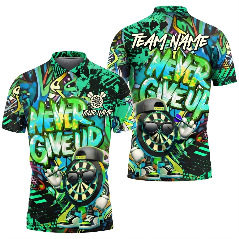 Stand out on game night with this custom darts polo shirt featuring a bold “Never Give Up” neon graffiti design.