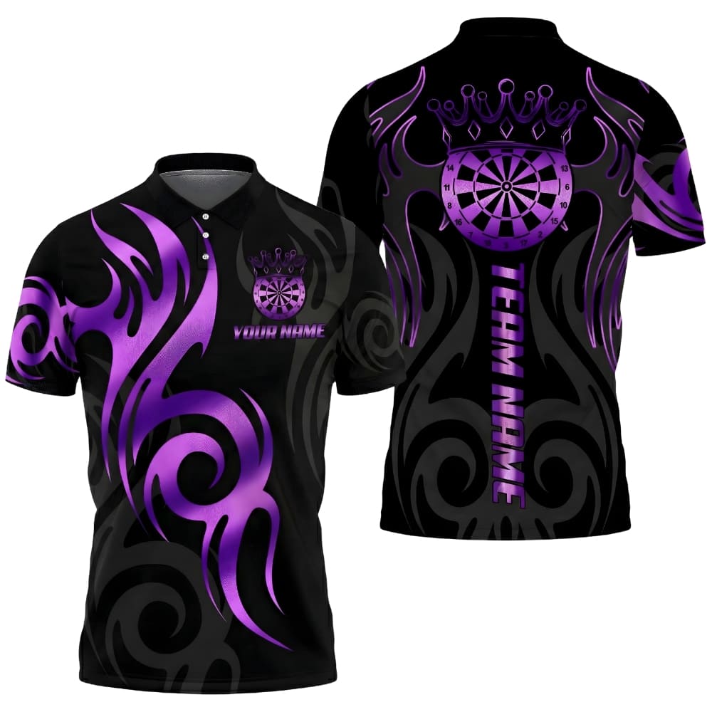 Level up your darts team look with this custom darts polo shirt featuring a bold crown dartboard graphic and tribal accents. Personalize it with your team name and player name—perfect for league nights, tournaments, and team uniforms. Premium all-over sublimation print with sharp details and long-lasting color.