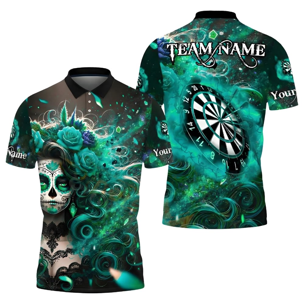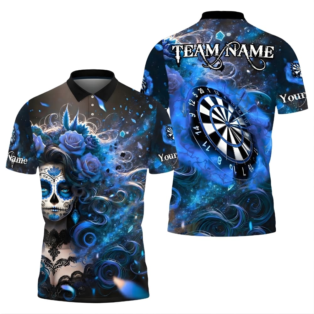 Stand out at every darts match with this custom darts polo shirt featuring a bold sugar skull design and realistic dartboard artwork. Fully personalized with your team name and player name, this shirt is perfect for darts leagues, tournaments, or practice nights. Made for comfort, durability, and serious darts style on and off the oche.