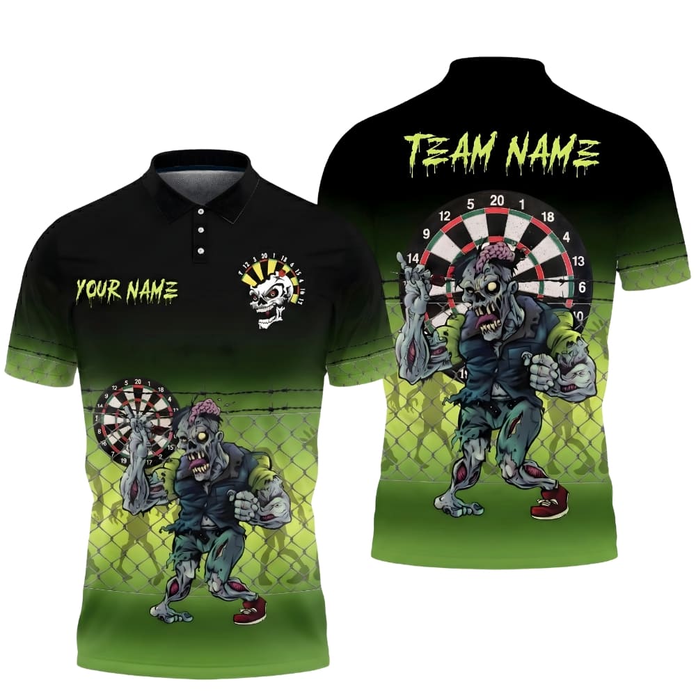 Make a bold statement with this custom darts polo shirt featuring a fierce zombie dartboard design, perfect for players who love dark, aggressive dart themes.