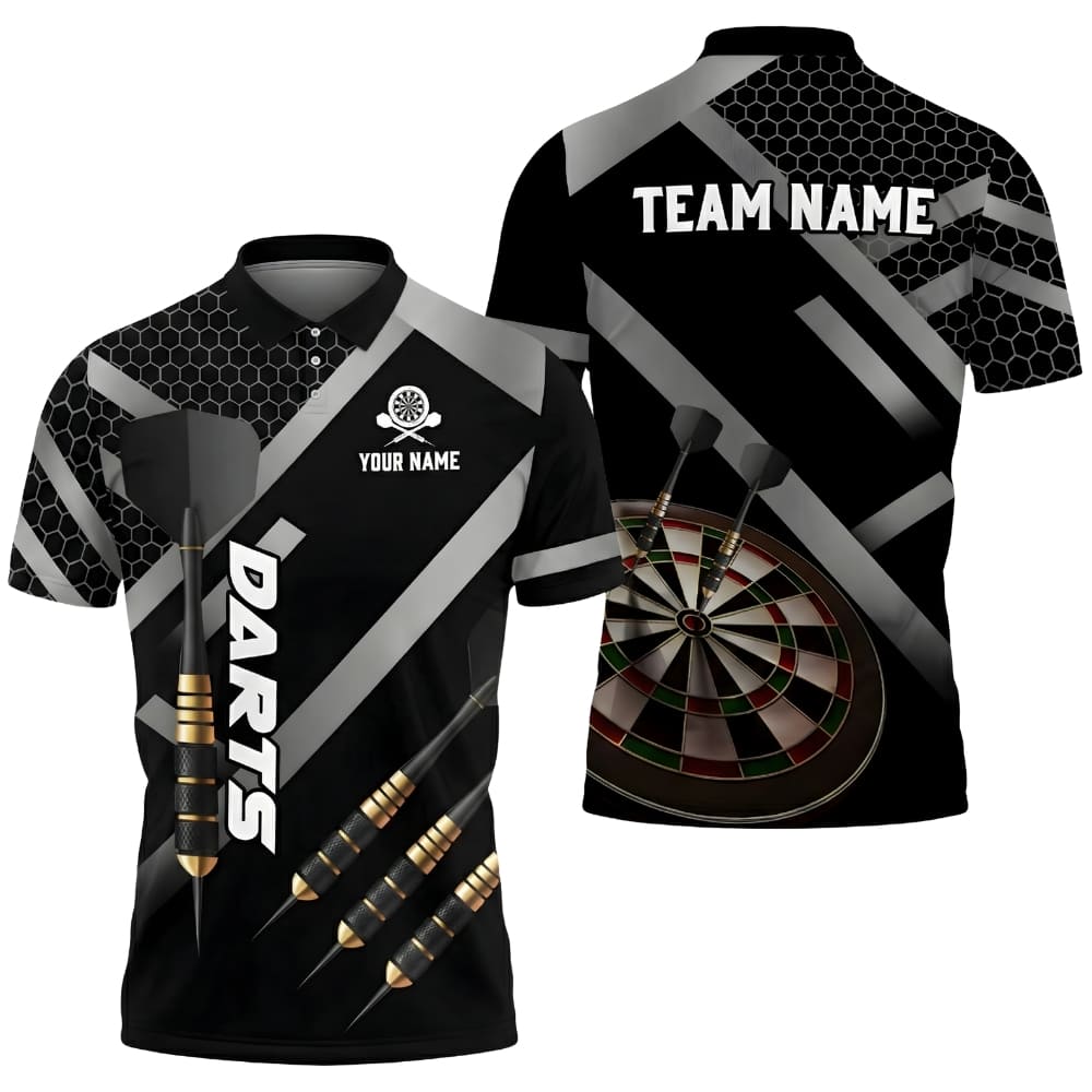 This custom darts polo shirt features a bold black geometric design with a dynamic dartboard graphic, perfect for competitive darts players and teams. Personalize it with your team name and player name for tournaments, leagues, or casual play. Lightweight, breathable fabric delivers comfort and performance on and off the oche.