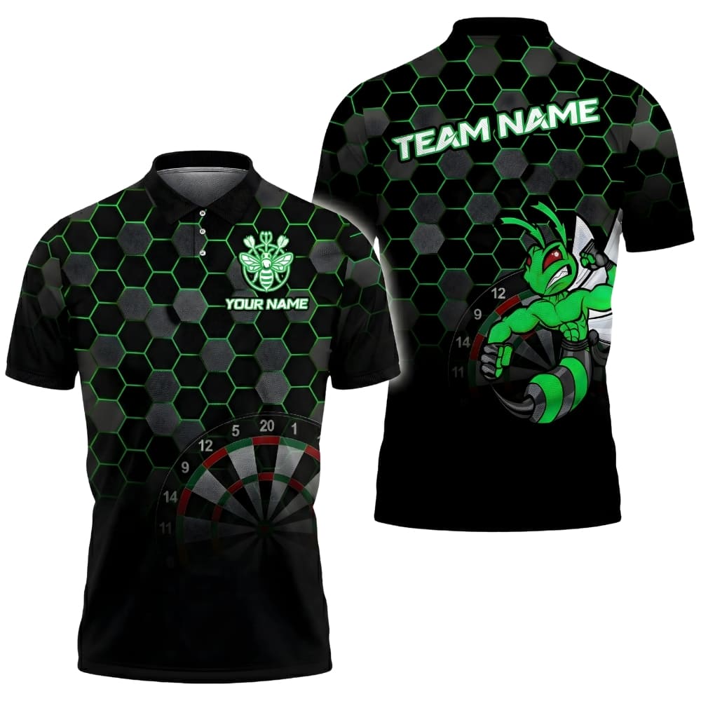 Stand out on the oche with this custom darts team shirt featuring a bold honeycomb pattern and fierce bee graphic. Personalized with your name and team name, this performance polo is designed for darts players who want a sharp, professional look. Perfect for league matches, tournaments, and competitive dart nights.