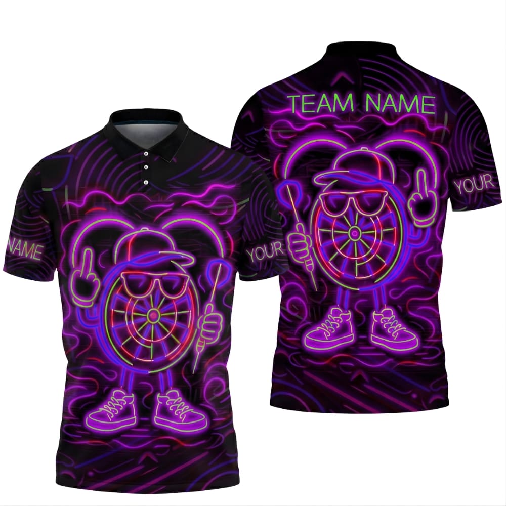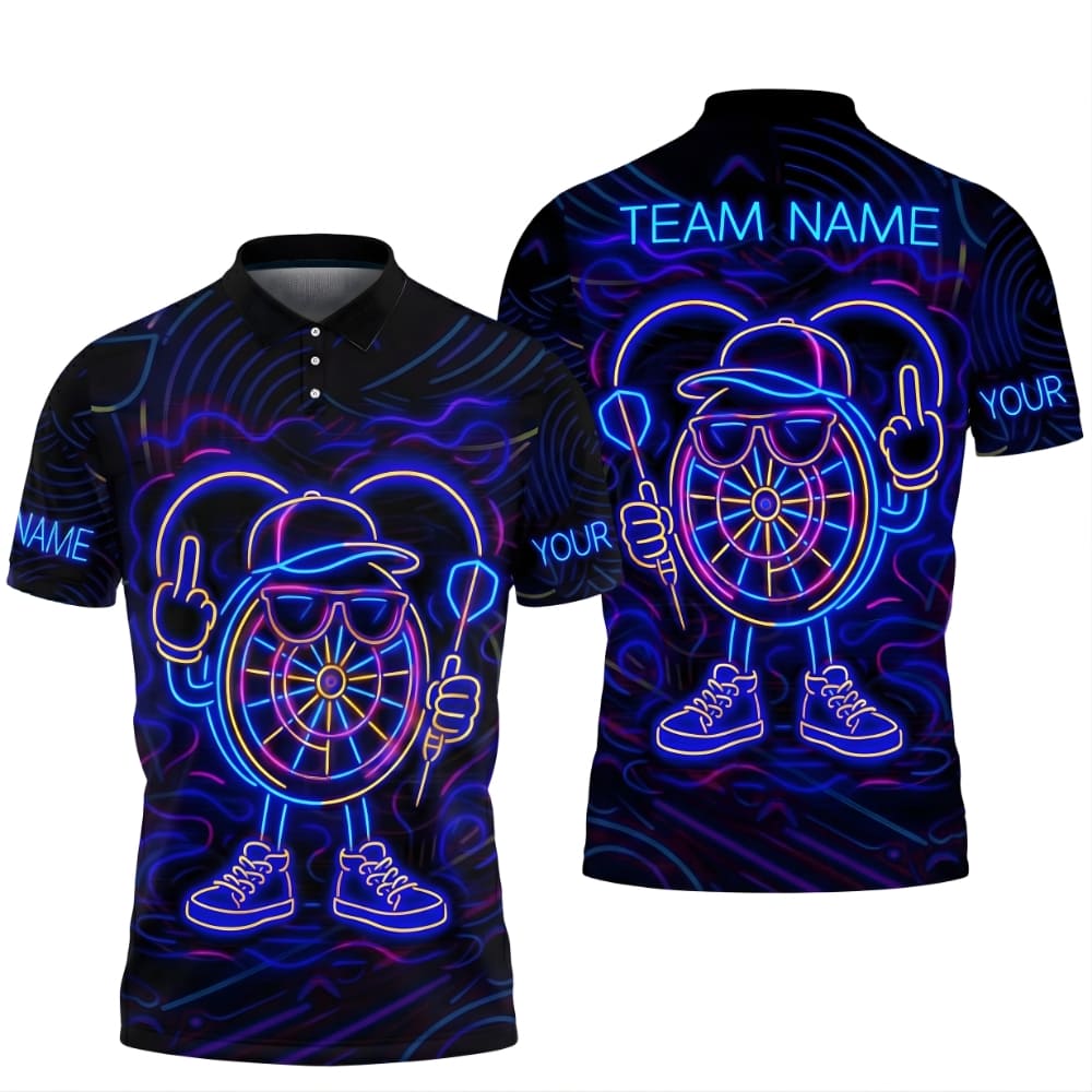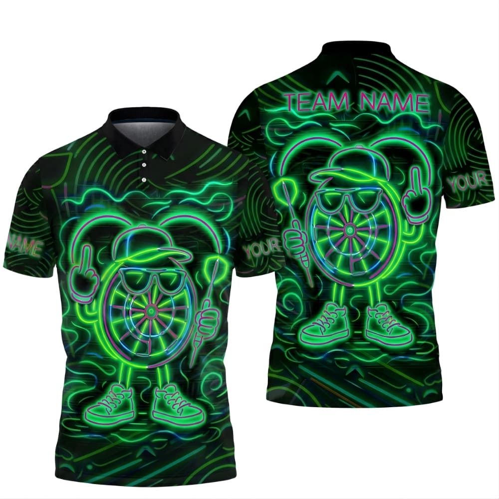 Stand out on dart night with this neon darts polo shirt, featuring a bold LED-style dartboard character and glowing graphics.