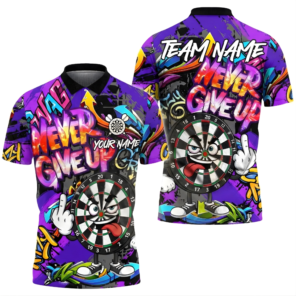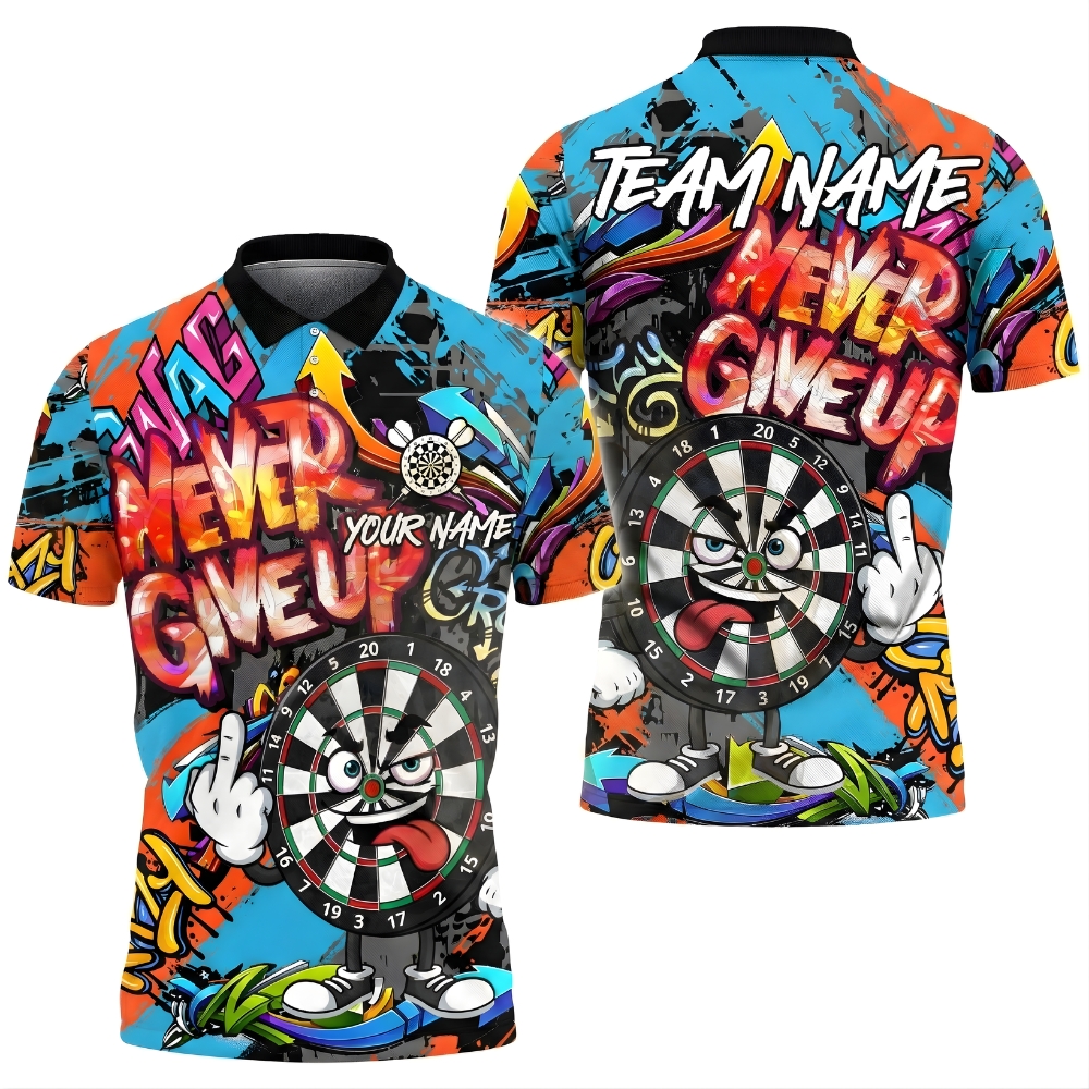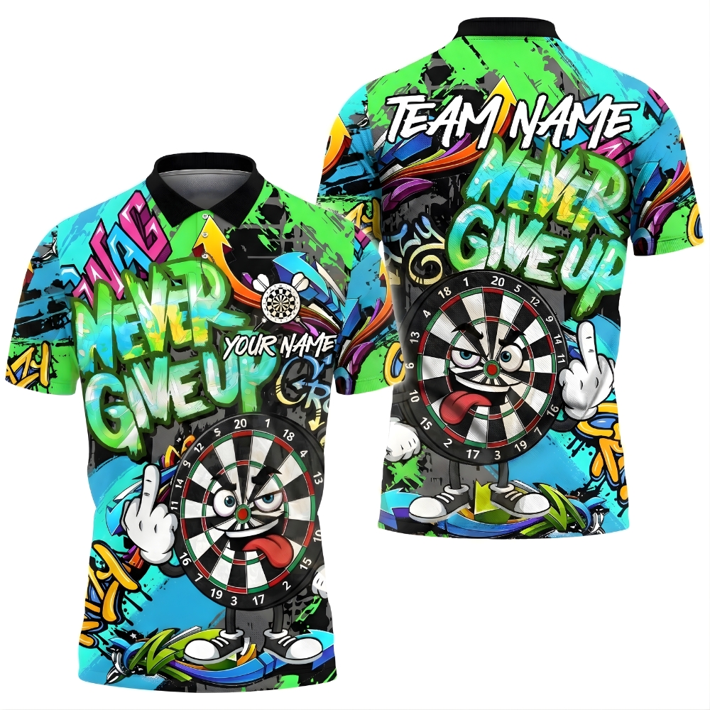 Show your fighting spirit with this Never Give Up darts polo shirt, featuring a bold cartoon dartboard character and graffiti-style graphics.