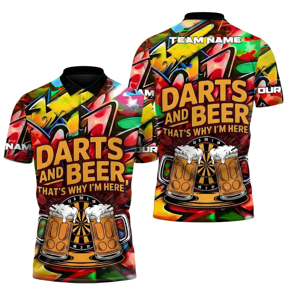 Show off your love for darts and beer with this personalized darts polo shirt featuring a bold “Darts and Beer – That’s Why I’m Here” graphic.