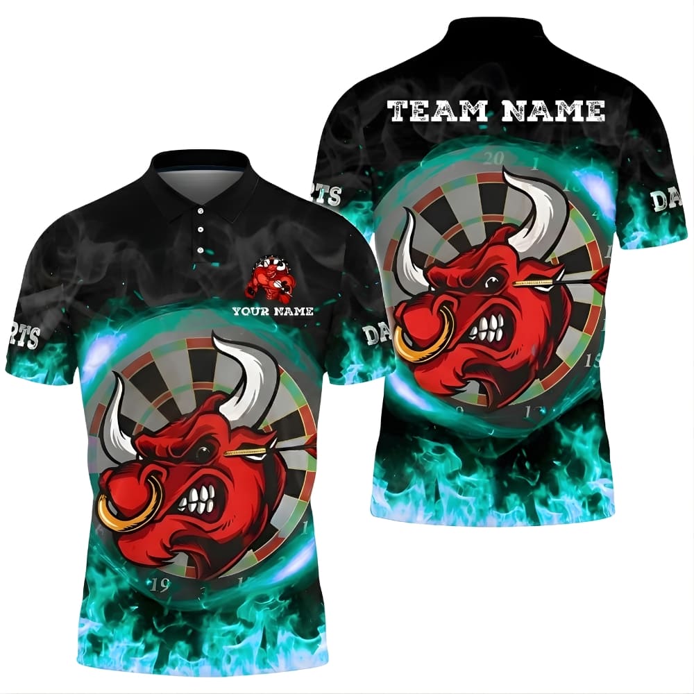 Personalized darts polo shirt featuring a bold bull head and dartboard design with dynamic flame effects.