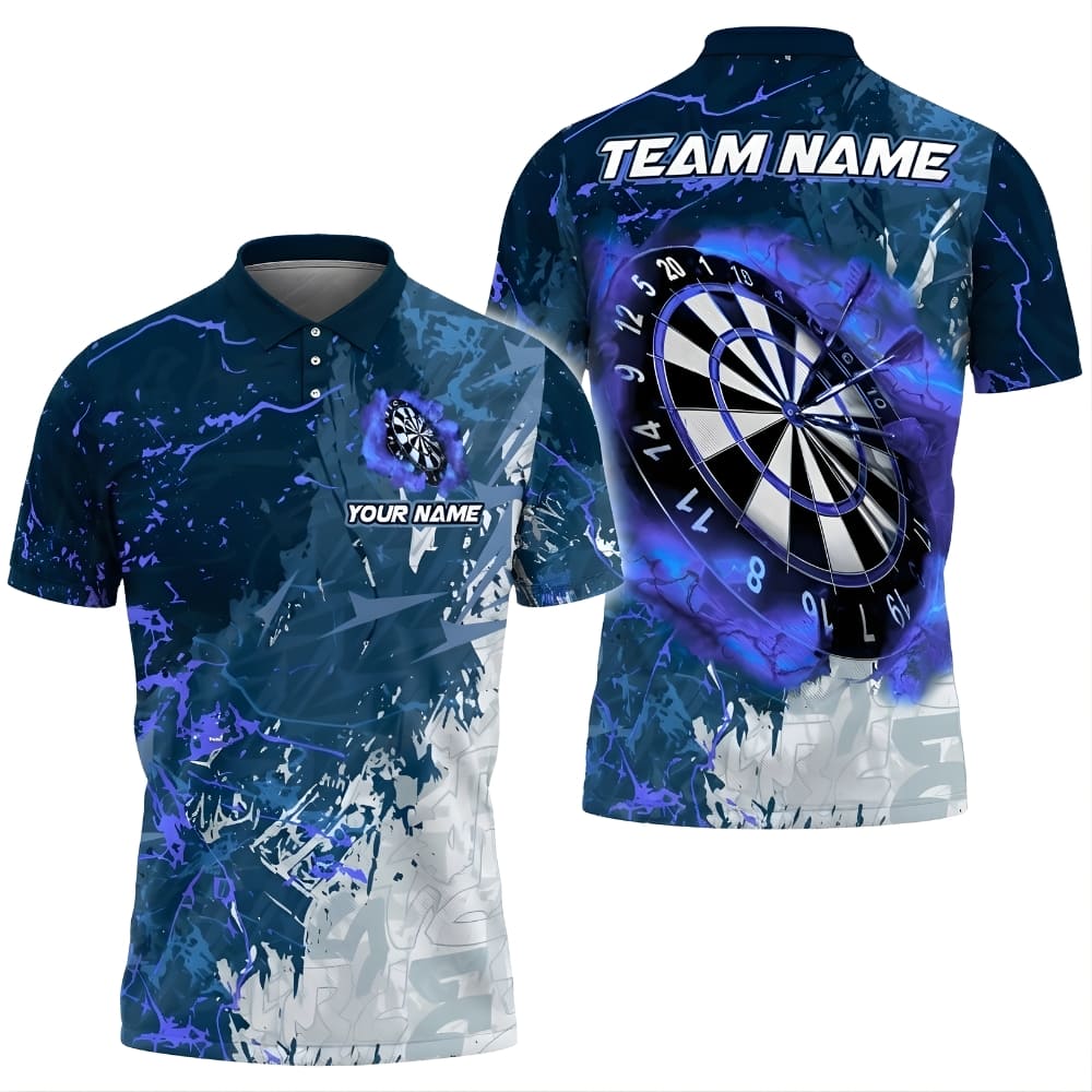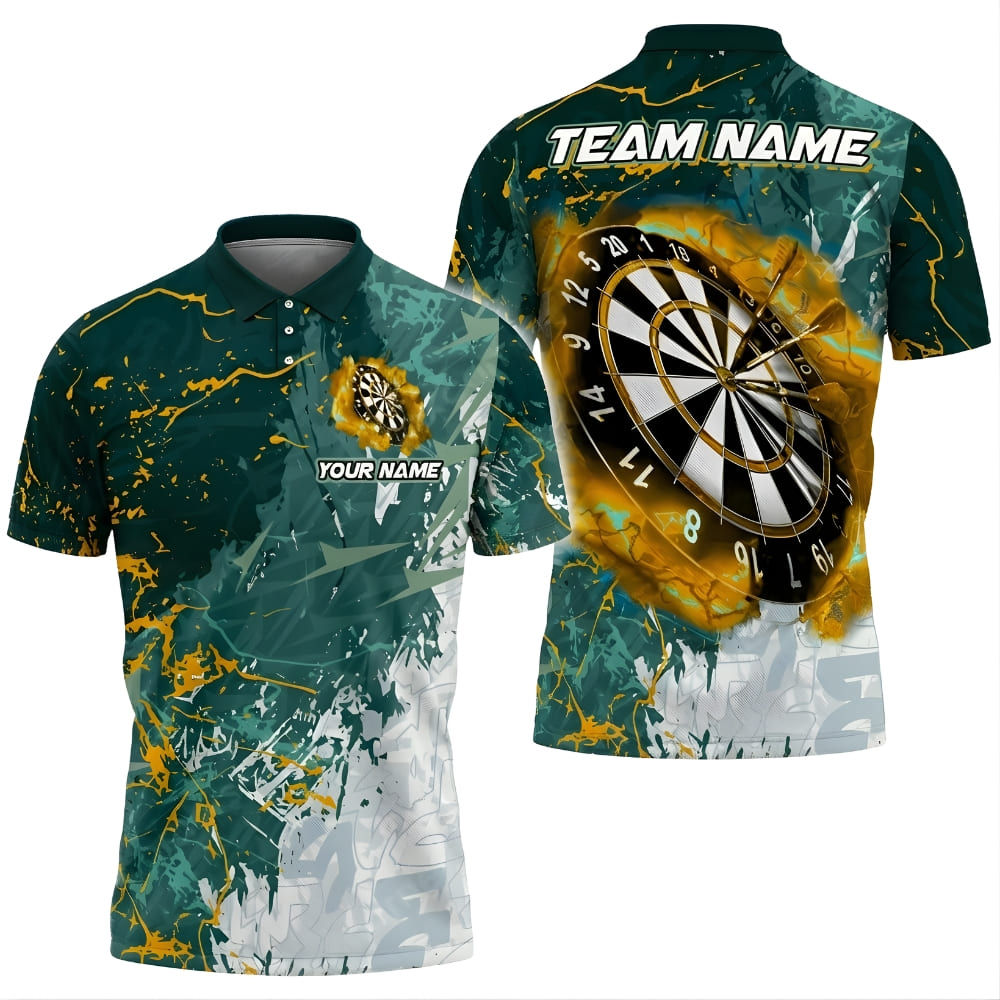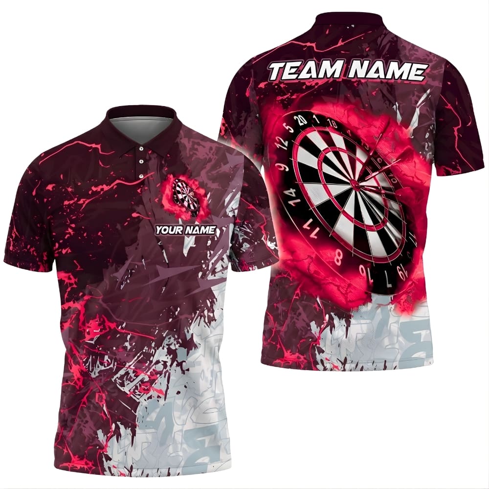Personalized darts polo shirt featuring a dynamic dartboard design with modern splash artwork.
