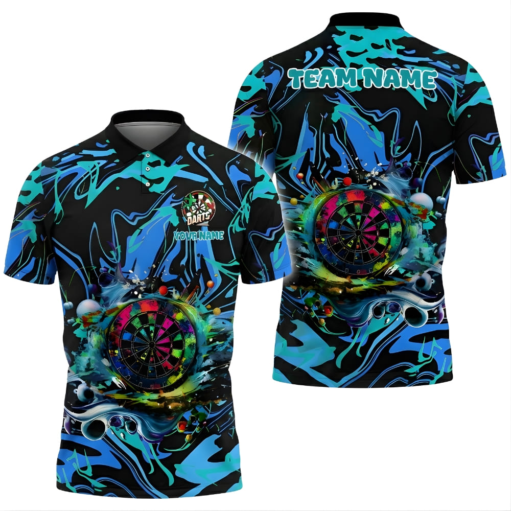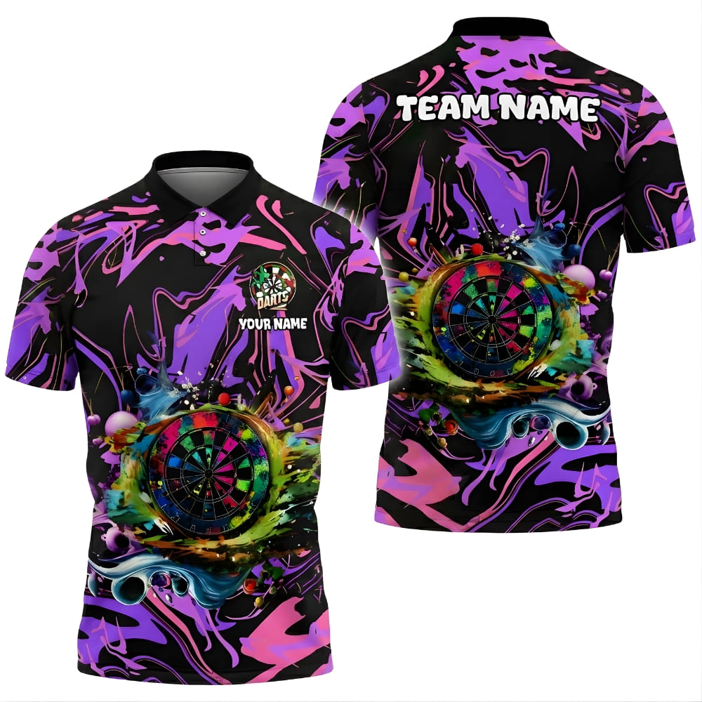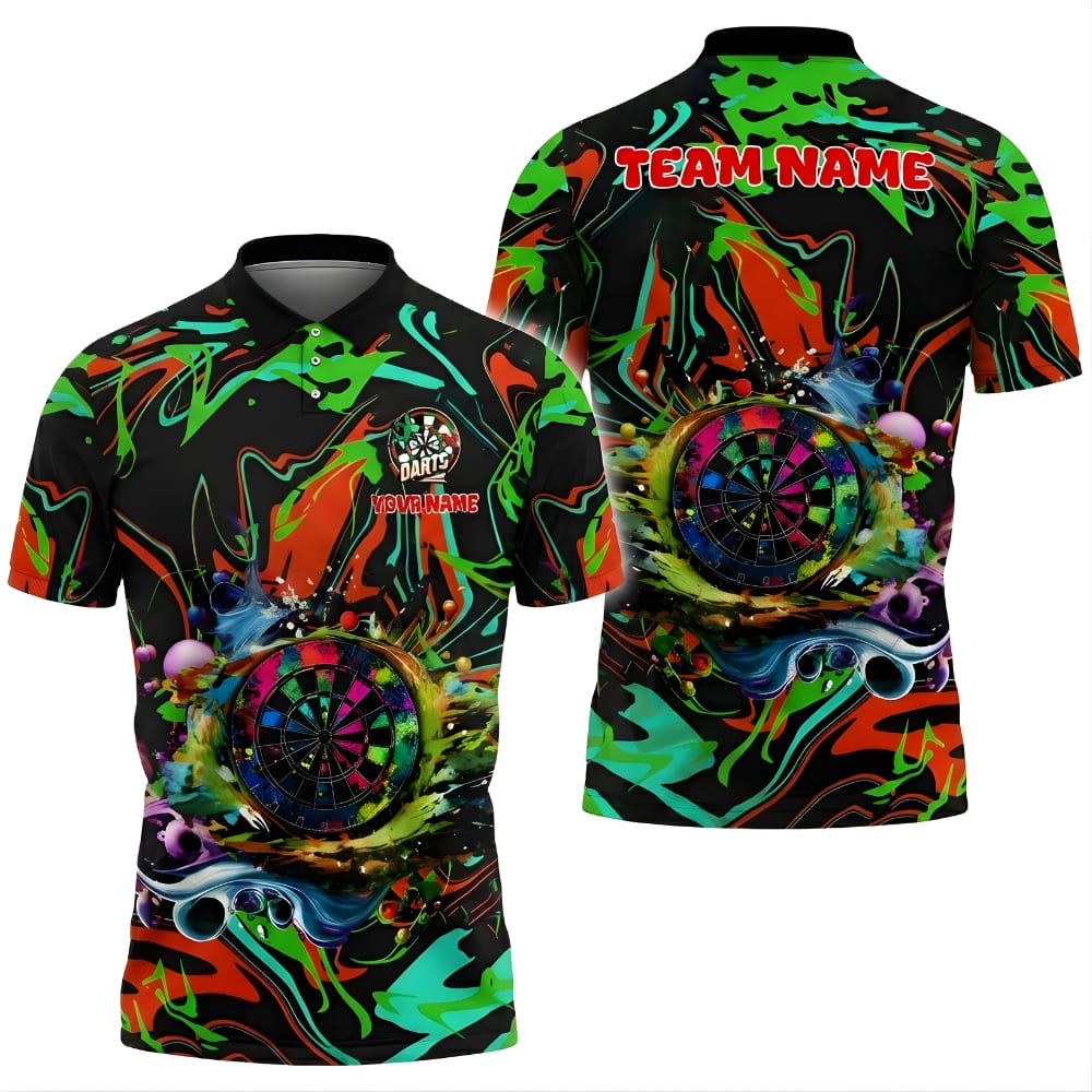 Personalized darts polo shirt featuring a vibrant dartboard design with bold paint splash effects.