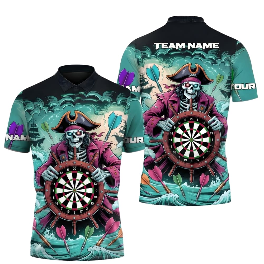This personalized pirate skeleton darts polo shirt features a bold skull pirate artwork combined with a classic dartboard design.