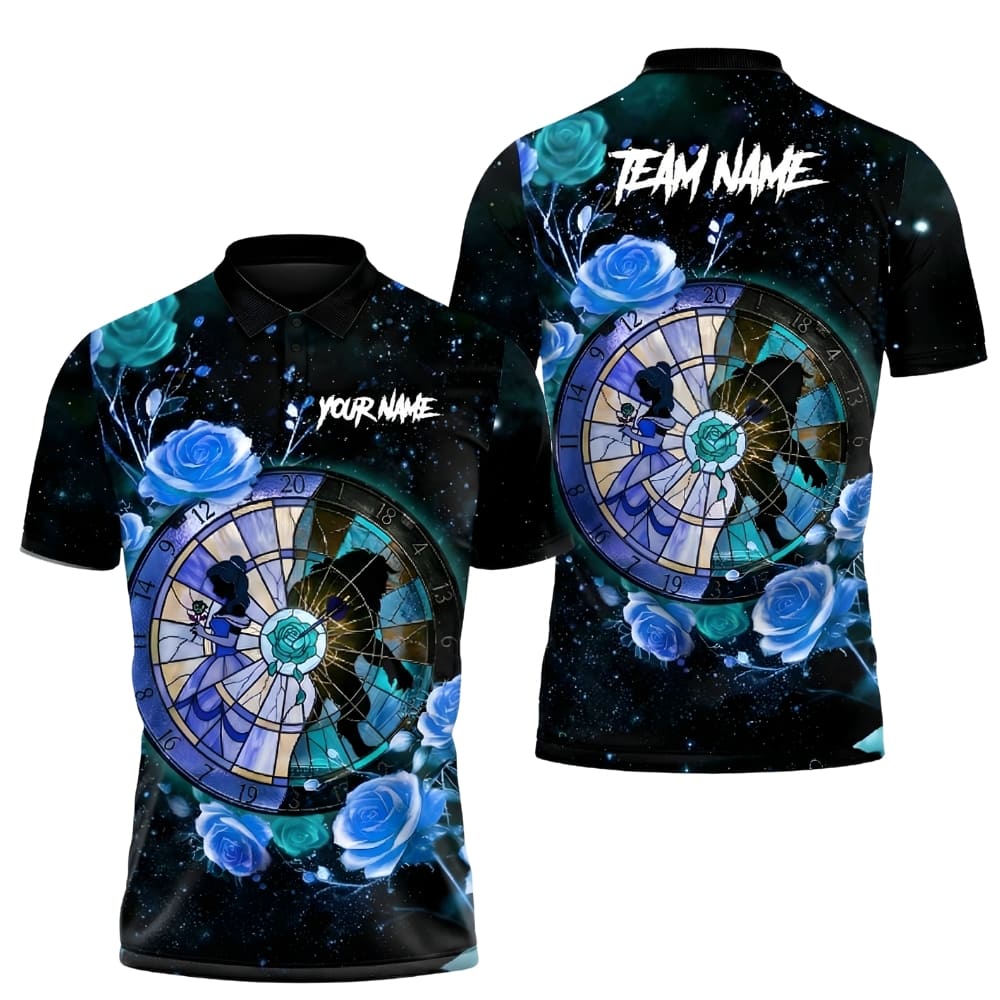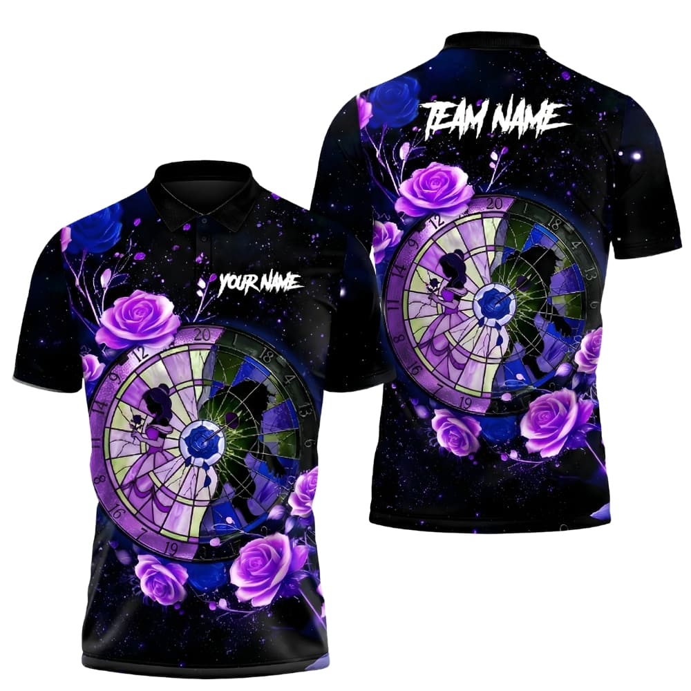 This personalized rose darts polo shirt features a stained-glass style dartboard design surrounded by elegant floral roses.