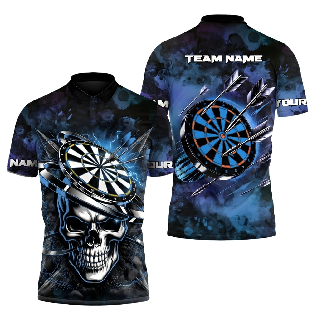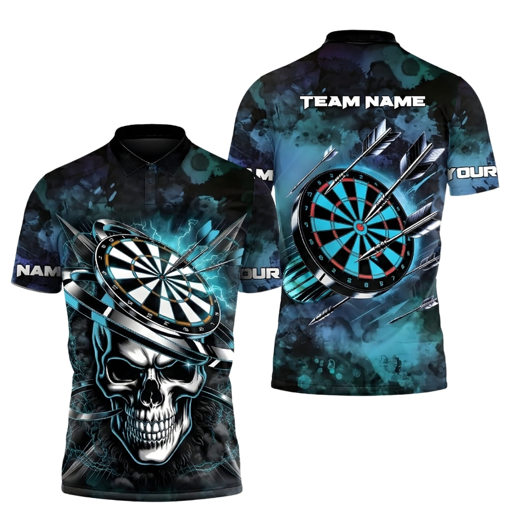 Dominate dart night with this personalized skull darts polo shirt featuring a bold skull and dartboard lightning design.