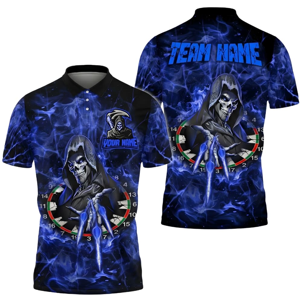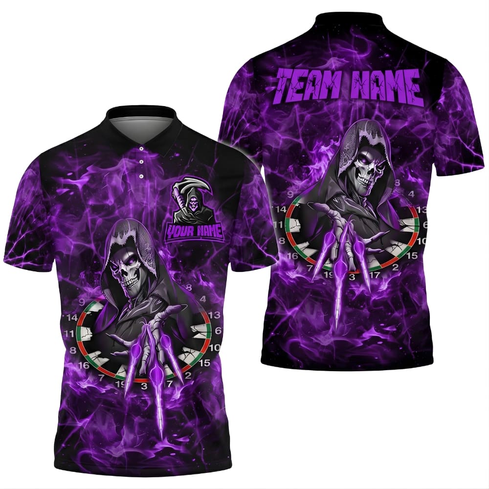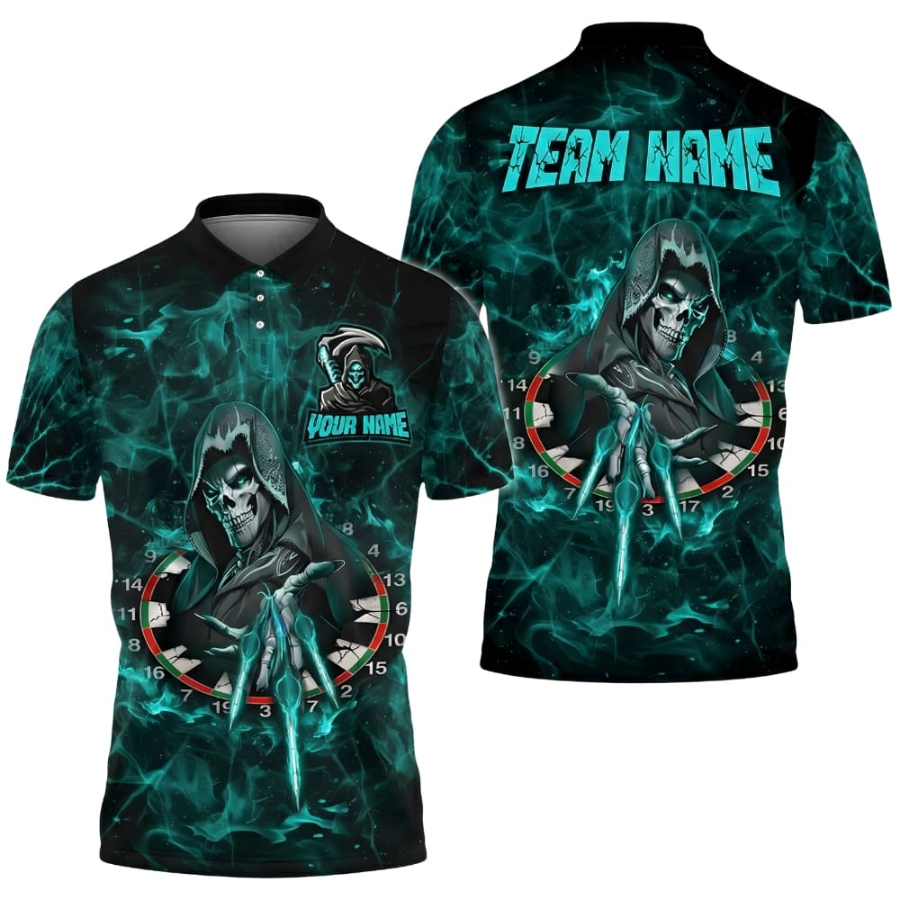 Unleash your dark side with this Reaper Darts Polo Shirt featuring a bold skull reaper and dartboard fantasy design. Fully customizable with team name and player name, perfect for dart leagues, tournaments, and players who want a powerful, intimidating look. Premium sublimation print with vibrant colors that stay sharp game after game.