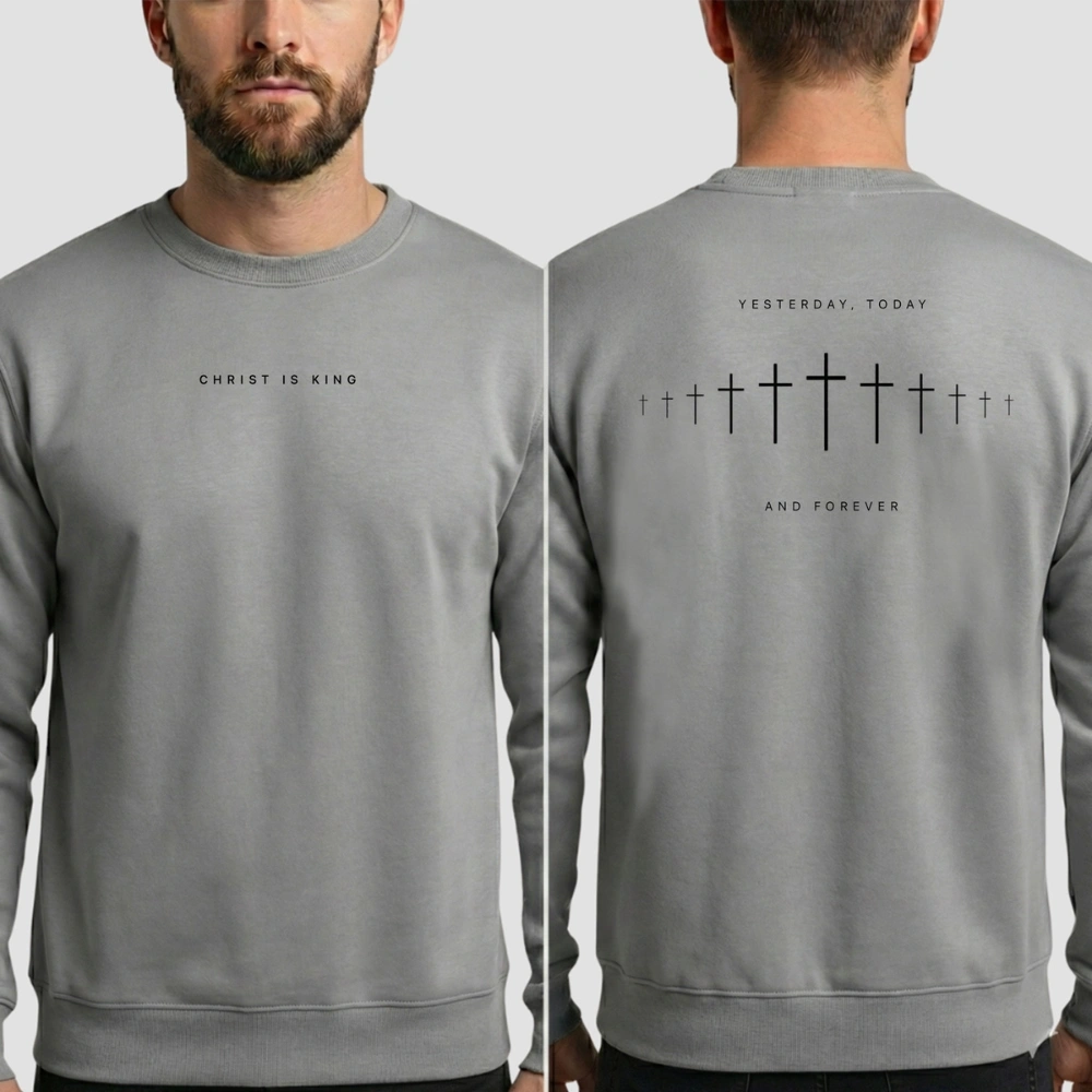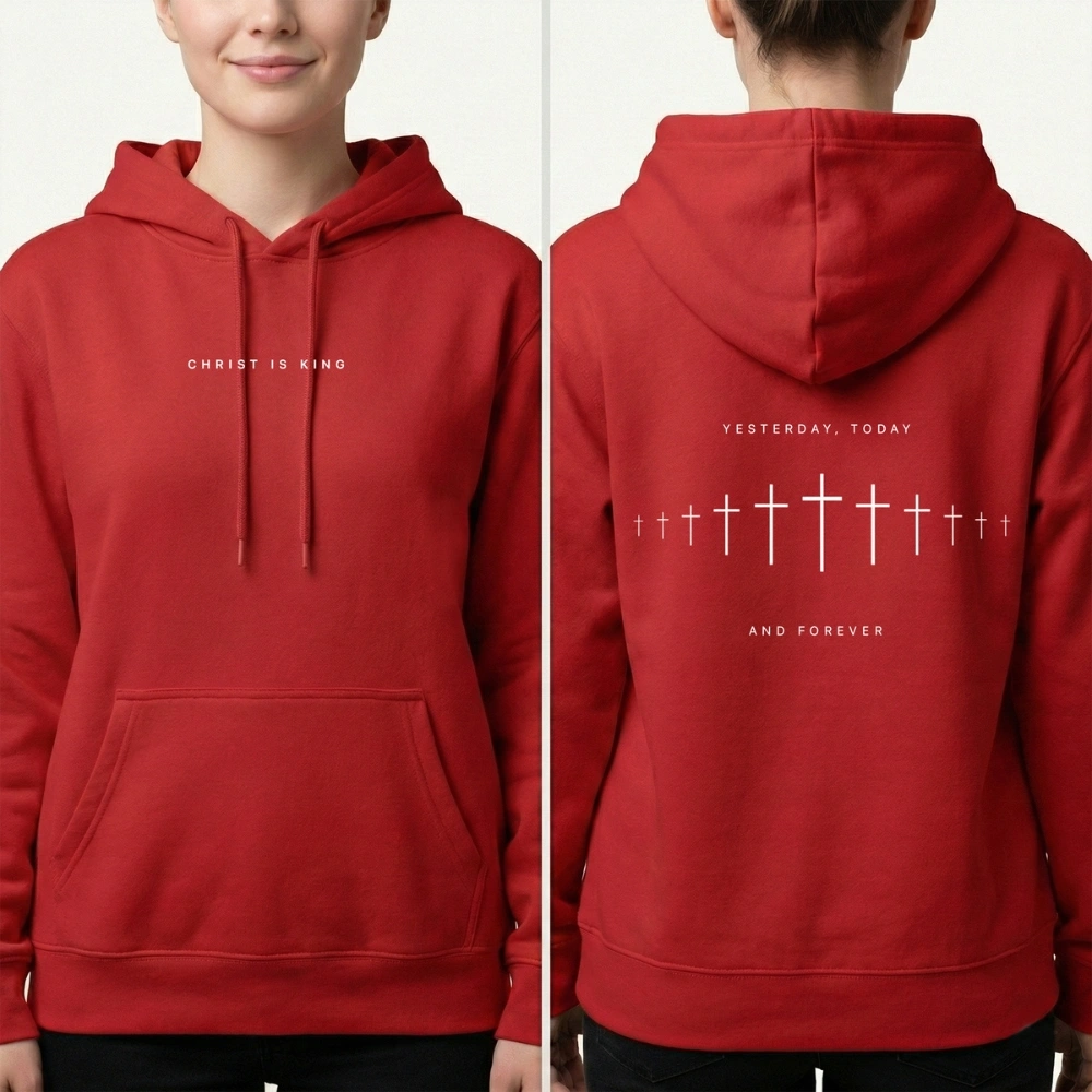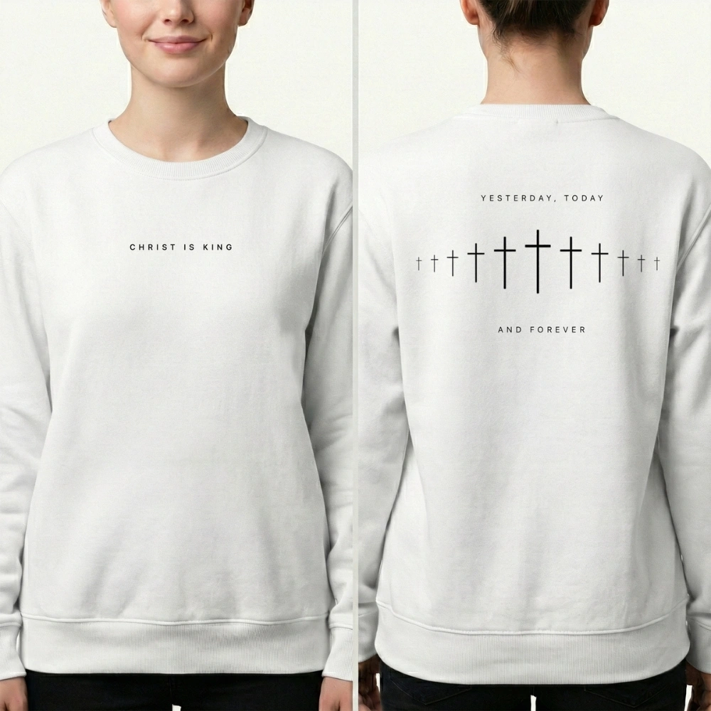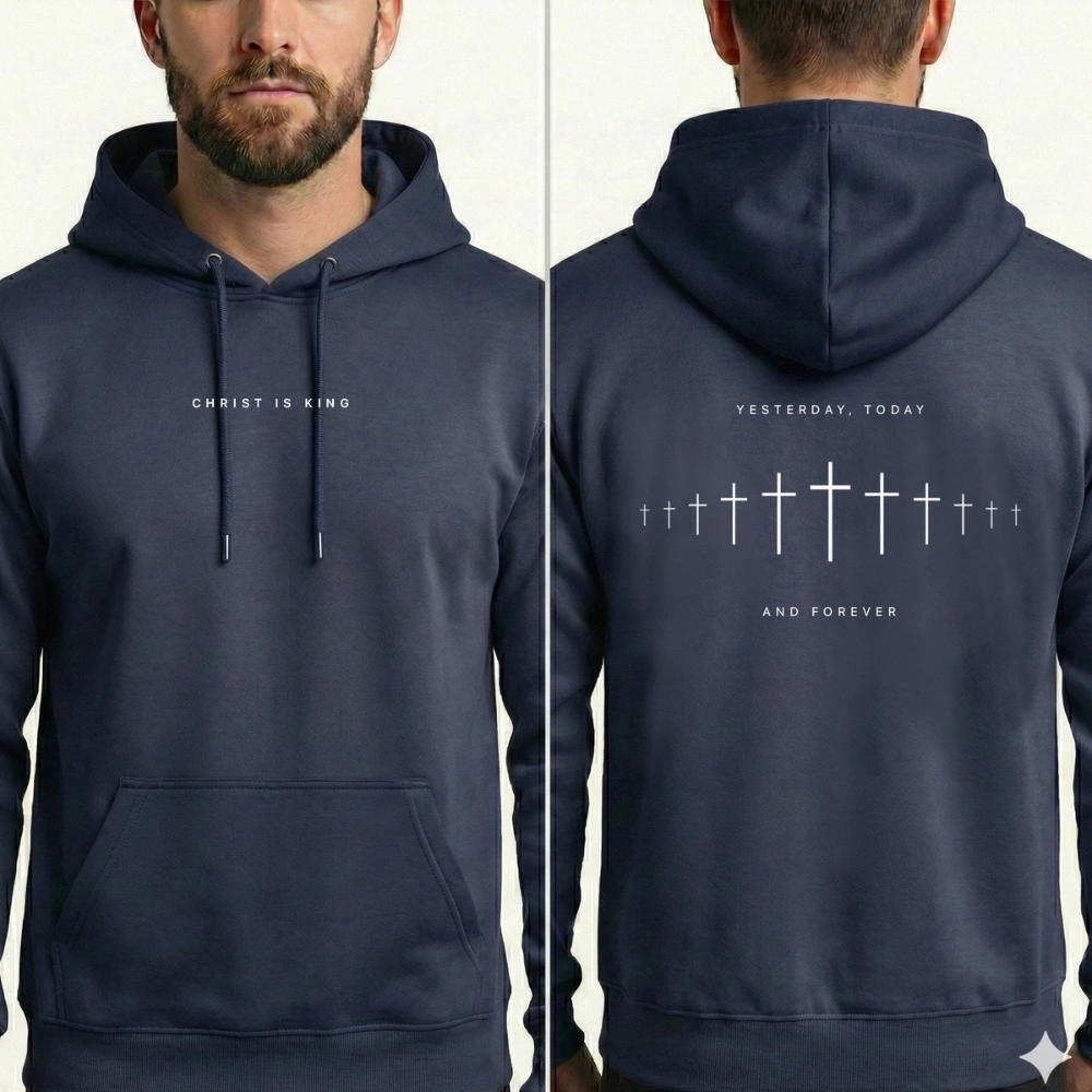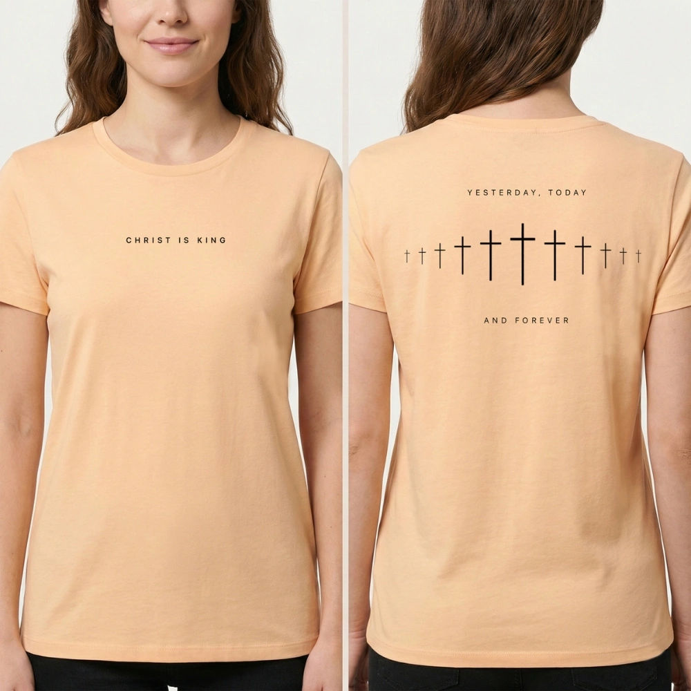 This design delivers a quiet yet powerful declaration of faith. The front features the simple statement “Christ Is King,” while the back illustrates a series of crosses paired with the message “Yesterday, Today, and Forever”—a reflection of Christ’s eternal reign.