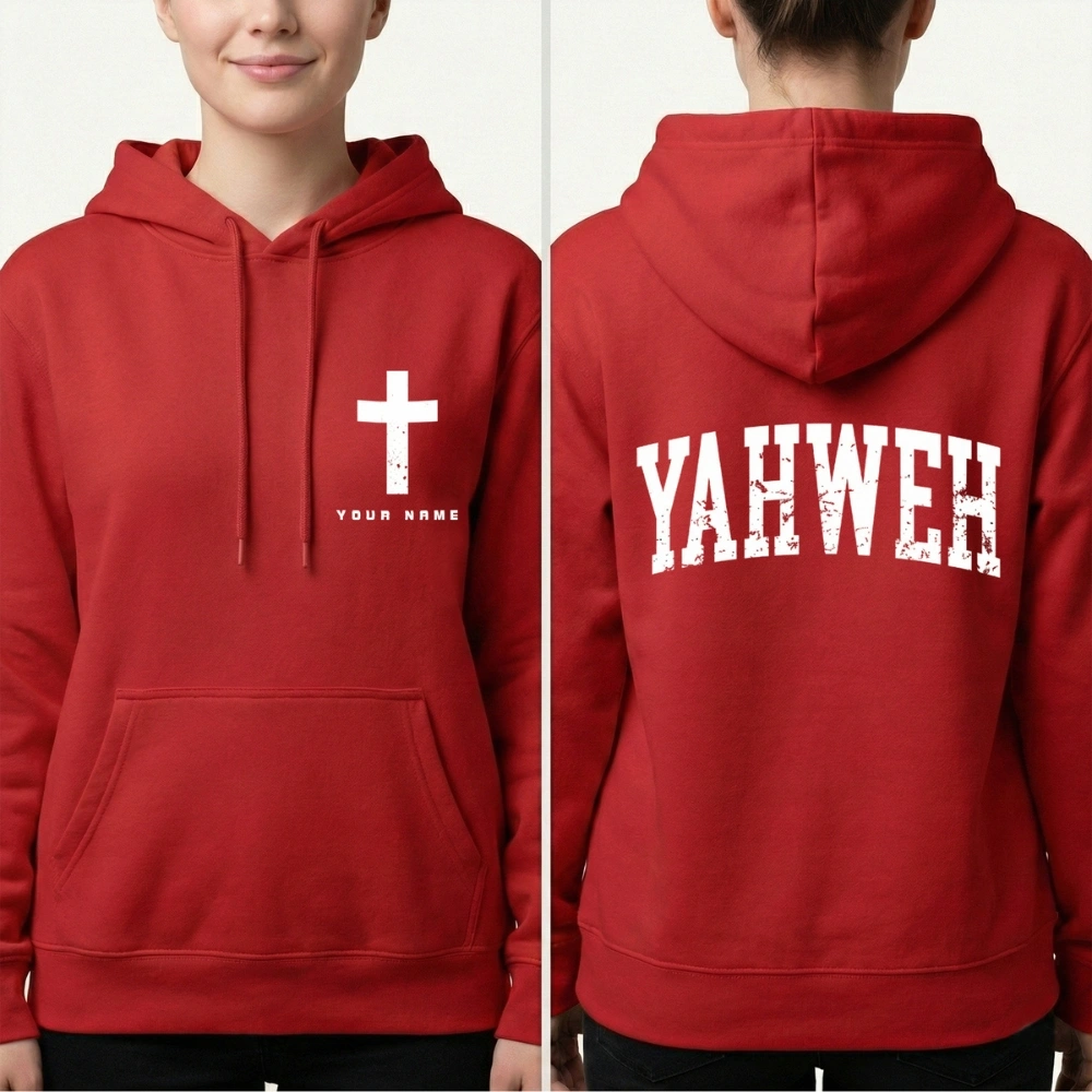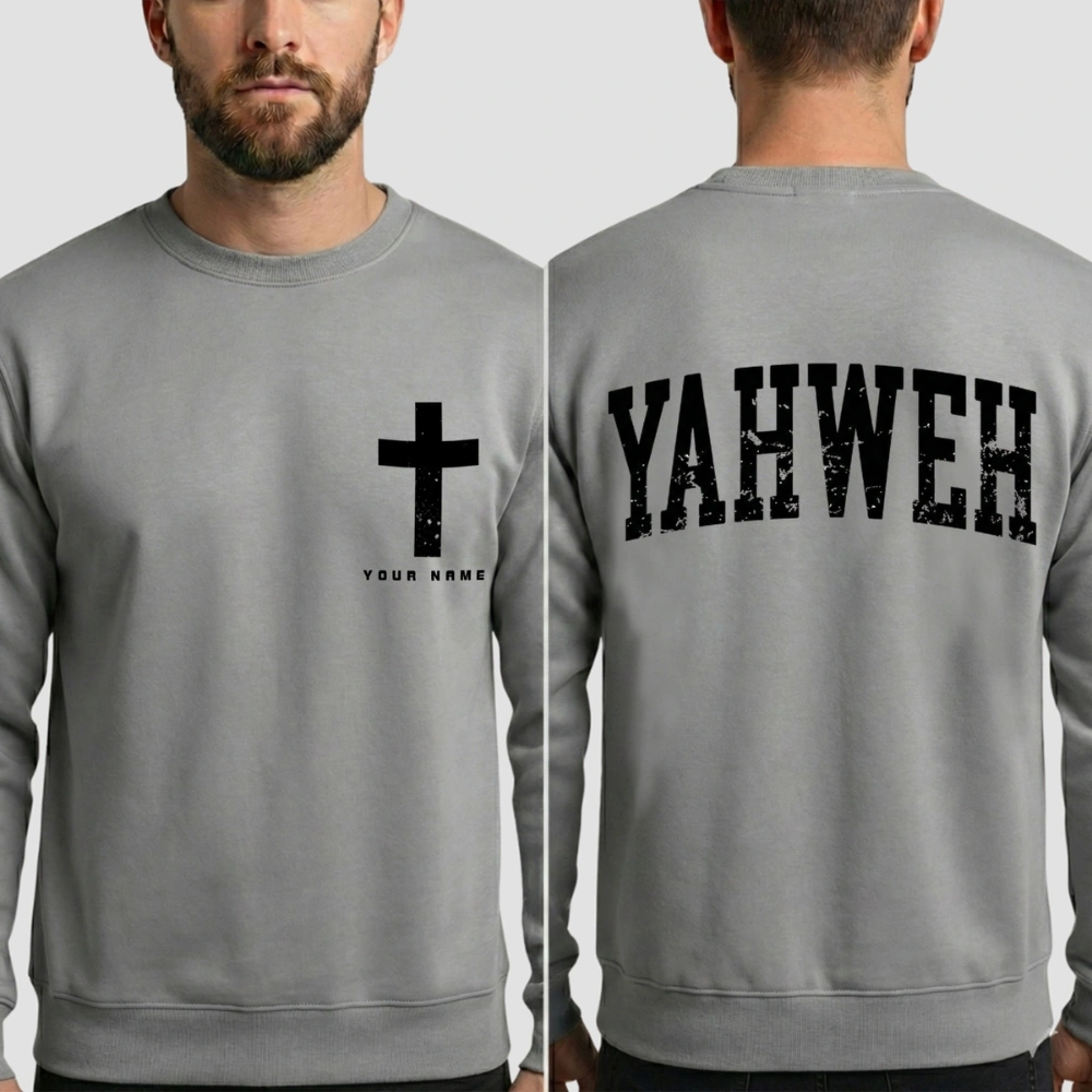 YAHWEH, the holy name of God, stands strong on the back, while the clean cross and personalized name on the front represent a personal walk with Him. Minimal, powerful, and unapologetic.